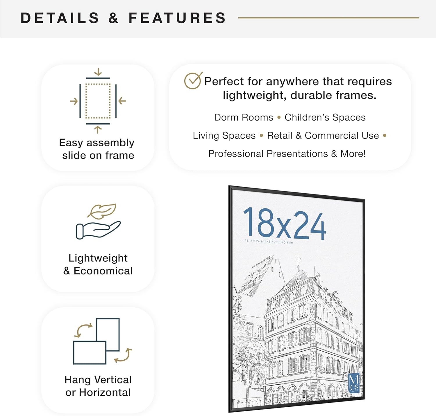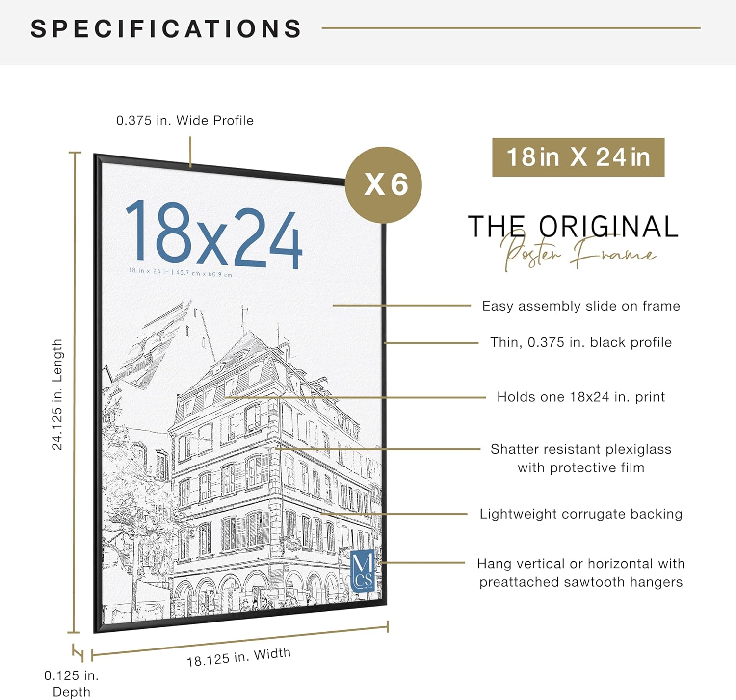 MCS Original Poster Frame 18x24 Black Lightweight Vertical & Horizontal Wall Hanging Large Picture Frame for Posters, Art Prints & Gallery Wall (6-Pack)