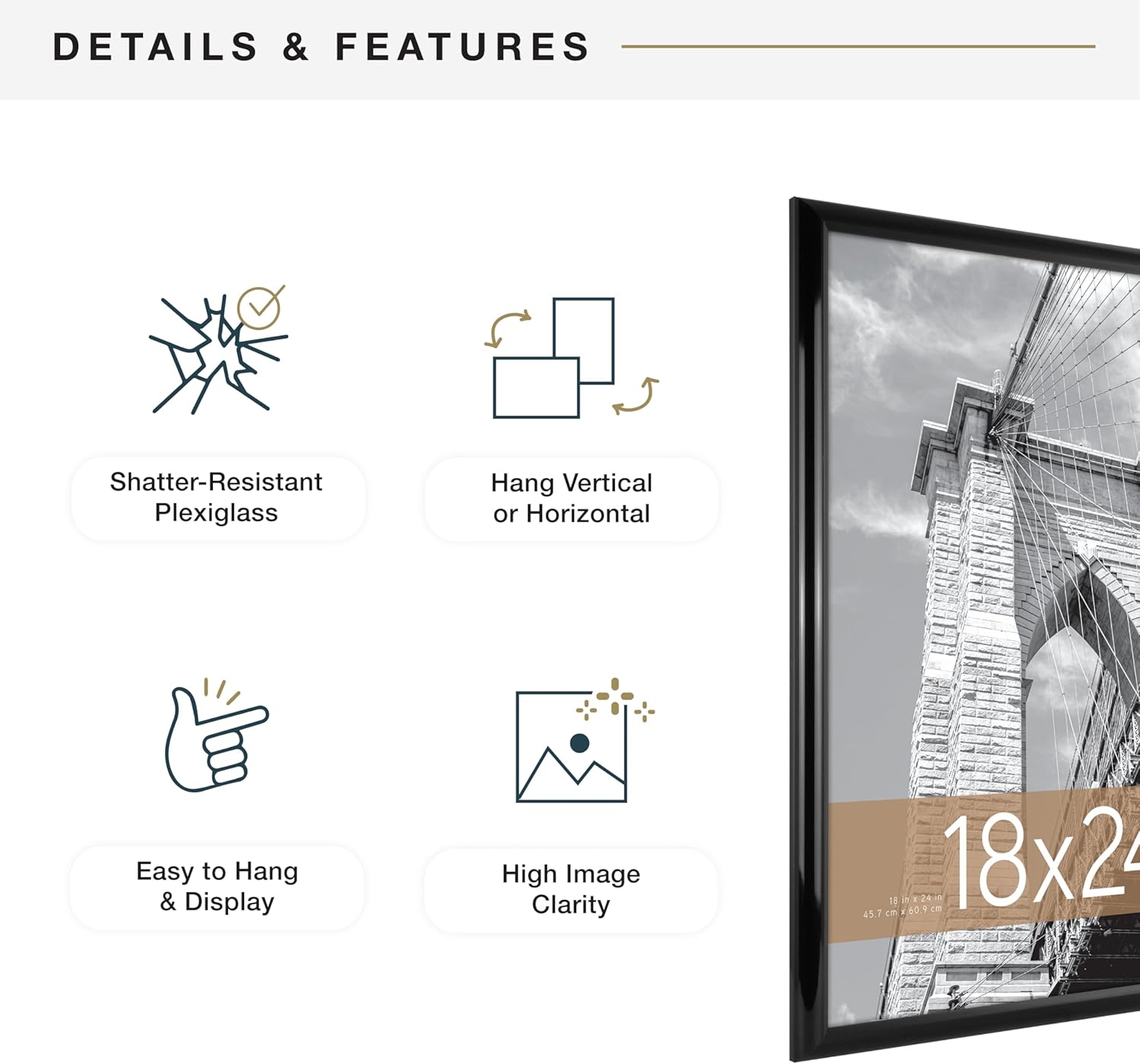 MCS Trendsetter 18x24 Poster Frame Black High-Gloss, Vertical & Horizontal Wall Hanging Large Picture Frame for Photos, Posters & Art Prints (2-Pack)