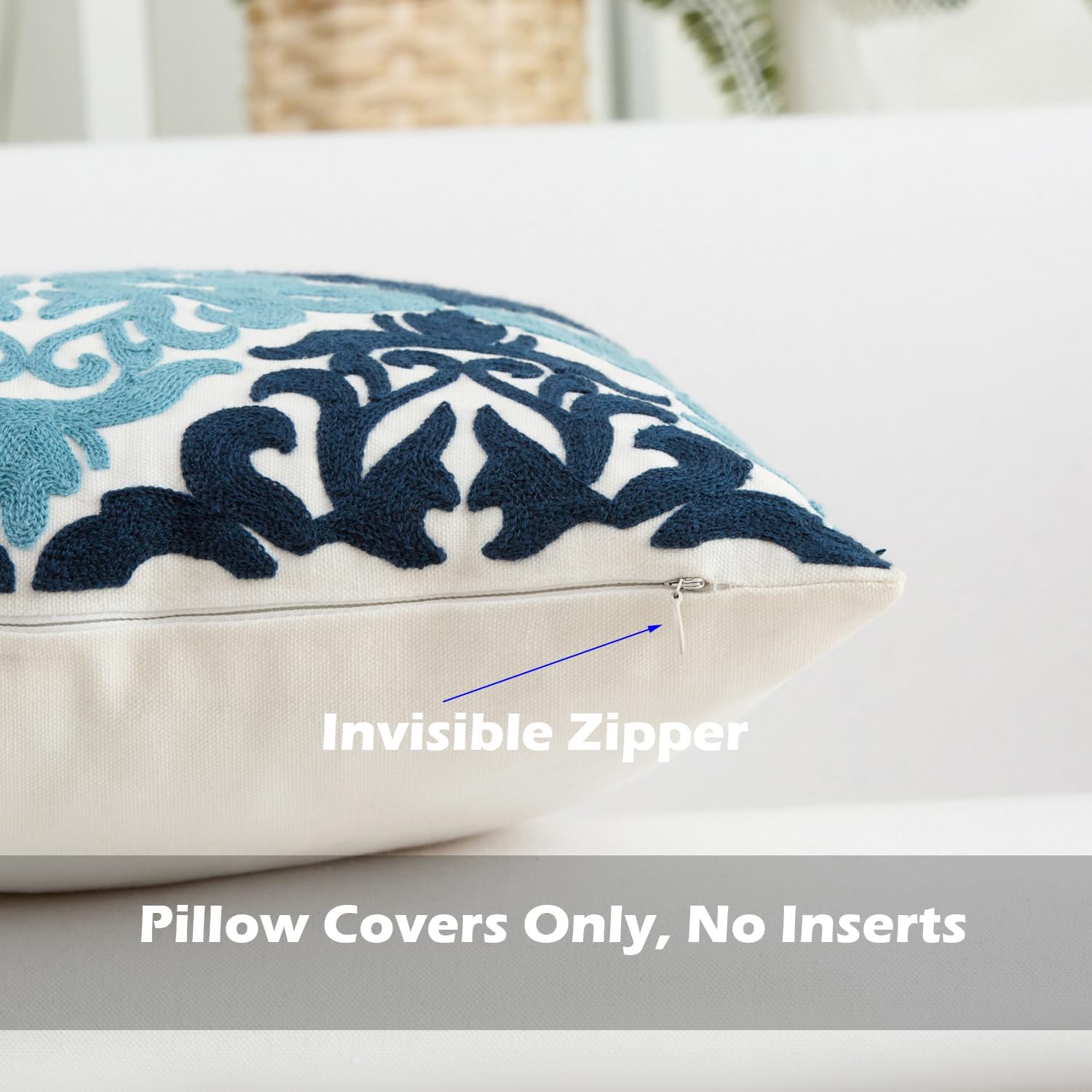 HWY 50 Blue Decorative Throw Pillow Covers 18x18 Inch (1 Piece), Embroidered Cotton Farmhouse Cushion Cover Pillow Case for Sofa Couch Living Room Bed Bedroon, Floral Geometric