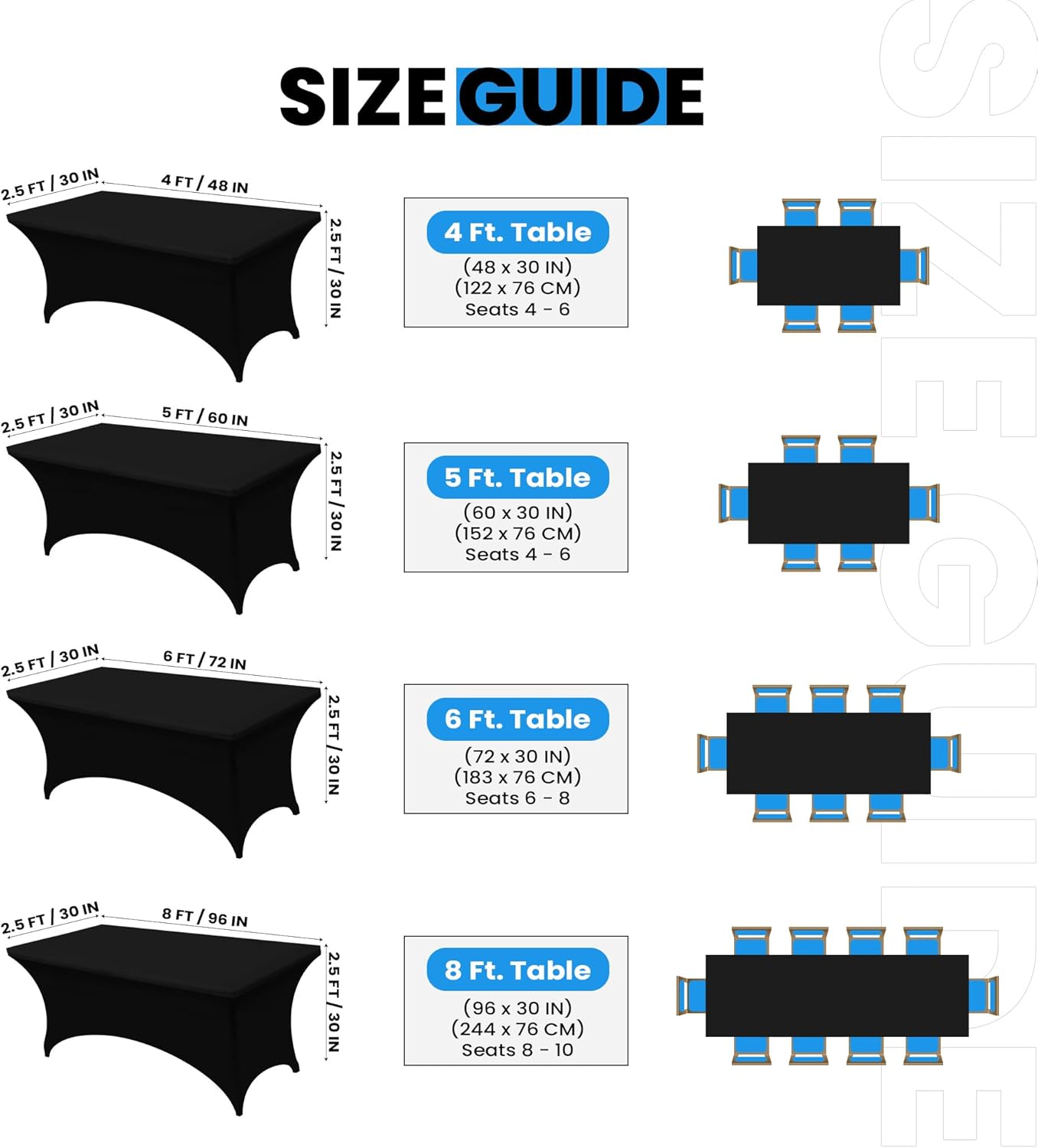 - Snug Fit with Reinforced Pockets: Designed for a 4-foot table (48"L x 30"W x 30"H), this 2-way stretch spandex cover features reinforced leg pockets to ensure a secure, professional look that won’t slip or ride up.