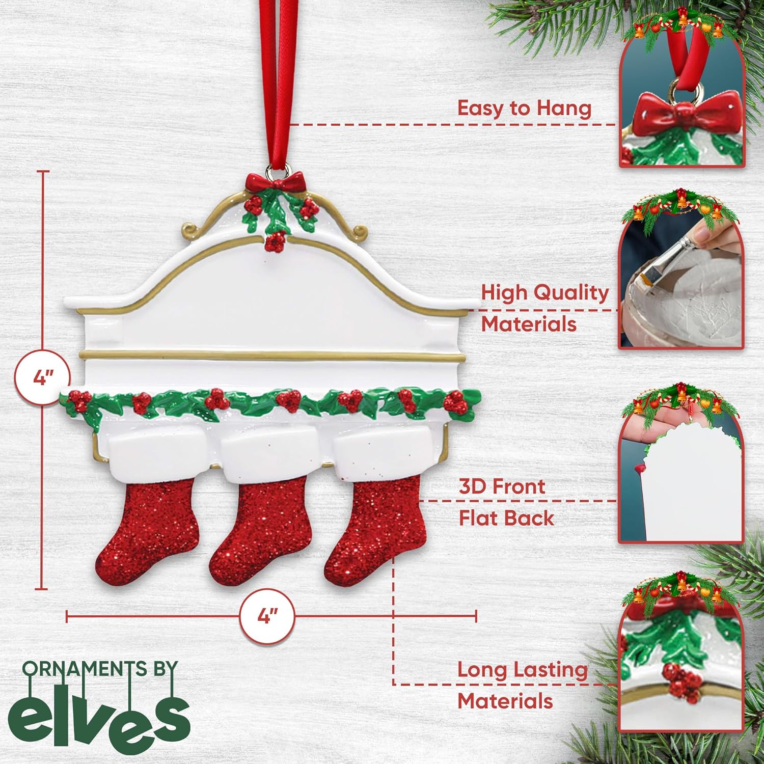- 🎁 Celebrate Your Family of 3: Mark a joyful milestone with a personalized family of 3 Christmas ornament 2025. Whether it’s your first year or a growing tradition, this keepsake honors your bond and tells your story with warmth, love, and a touch of festive magic. This white and gold fireplace ornament features glitter red Christmas stockings, a red bow holiday decoration, and a festive holly garland with berries, all set against a blank mantle for personalization.