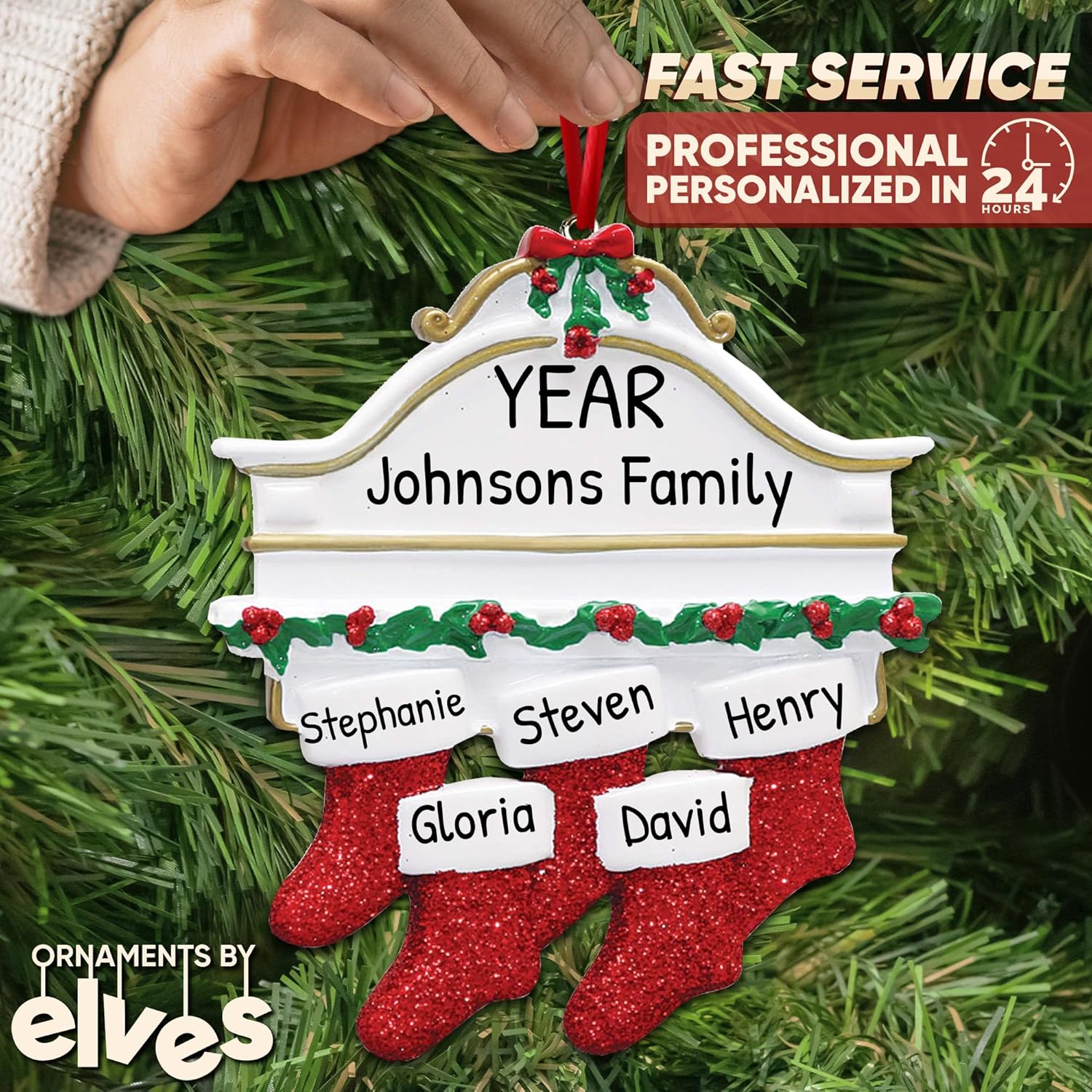 3D White Mantle Family of 5 Christmas Ornament 2025 Personalized Family Christmas Ornaments 2025 | Garland Fireplace Personalized Tree Ornaments Customizable Gifts Red Stockings of Five Ornament