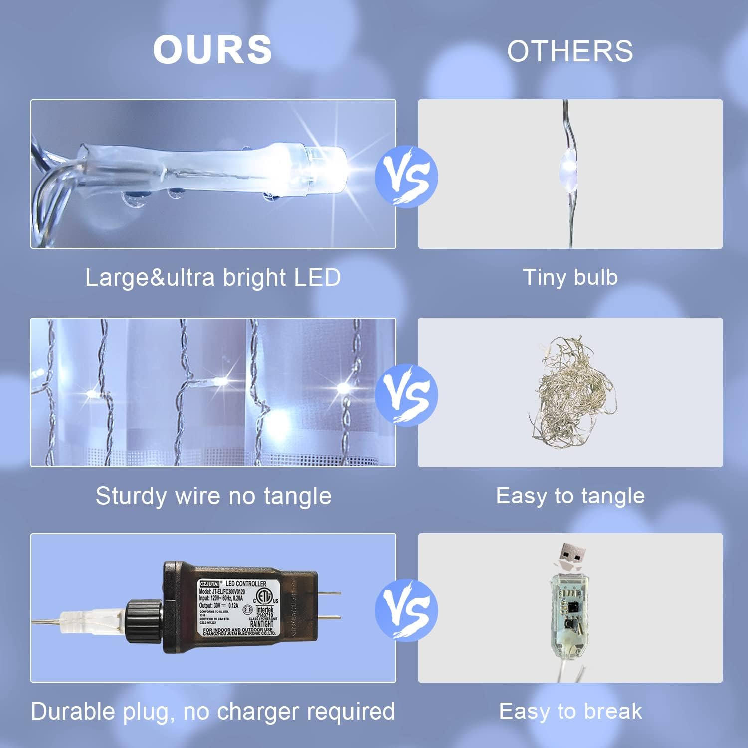 - PREMIUM AND SAFETY WHITE CURTAIN LIGHTS - The 300LED white curtain string lights have 300 LED on a 9.8FTx9.8FT lighting strand and the lead wire is 9.8FT. The curtain light has passed the authoritative UL588 certification, using a 30V low voltage plug, which is lower than the human body safe voltage of 36V, and very safe to use. NOTE: FOR LIGHT BRIGHTNESS AND SECURITY, MULTIPLE LIGHT SETS CAN NOT BE CONNECTED.