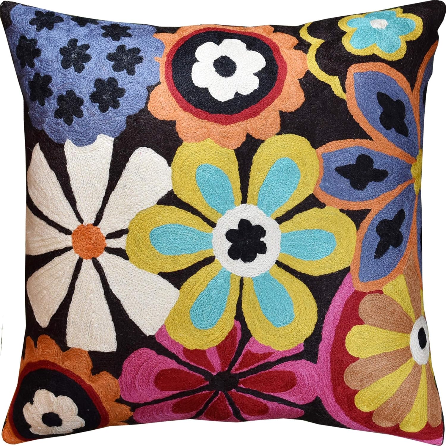 Modern Black Daisy Floral Pillow Cover Accent Flower Traditional Pillowcase Hand Embroidered Florals Couch Pillowsham Boho Outdoor Cushion Suzani Accent Pillow Wool 18x18 Inch