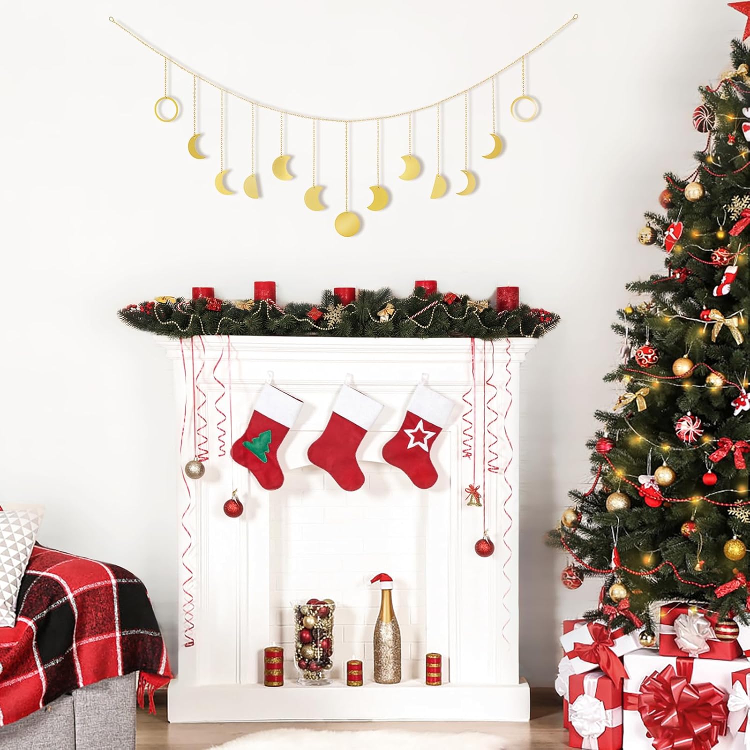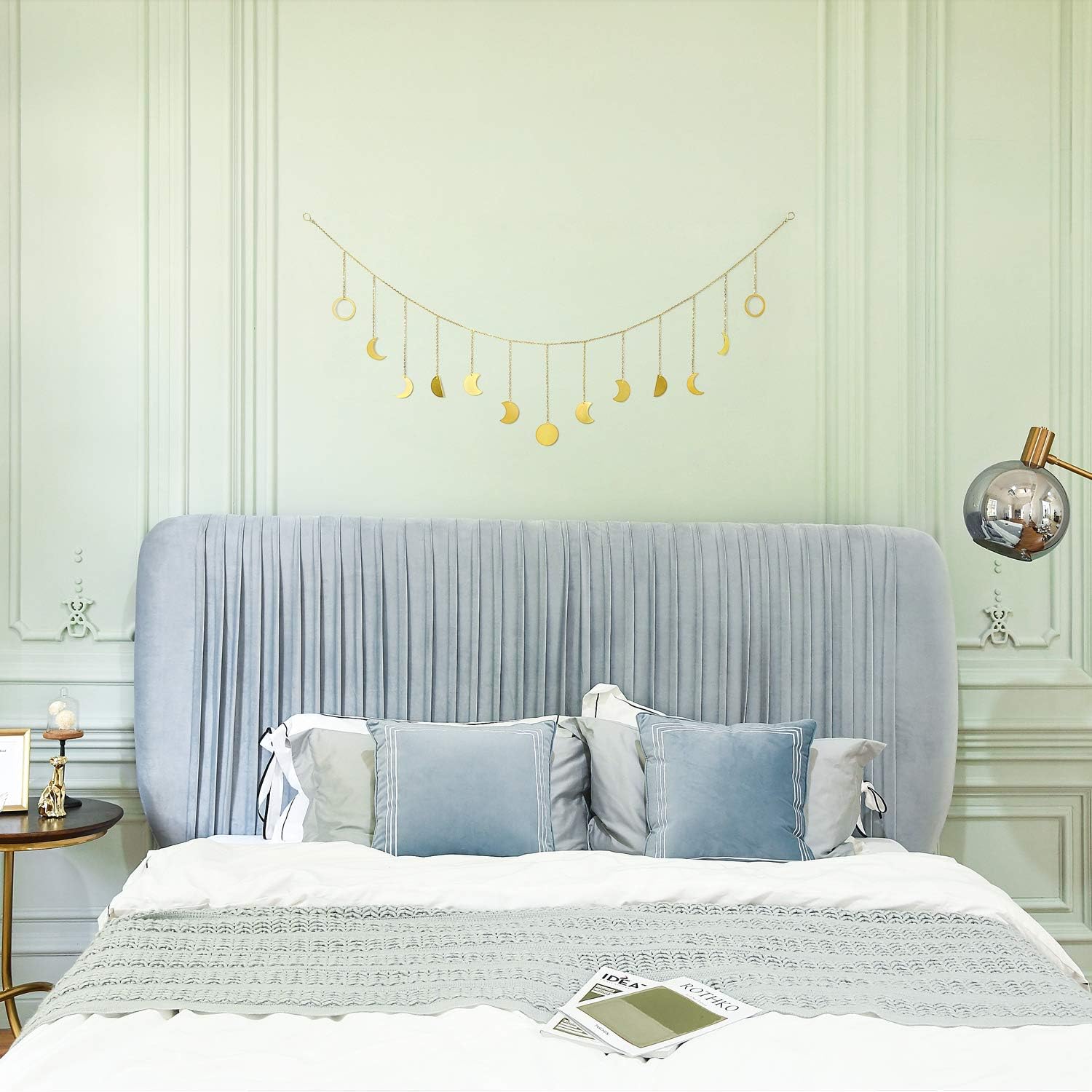 Mkono Moon Phase Wall Hanging Boho Aesthetic Room Decor Metal Moons Garland Hanging Art Bohemian Home Decoration for Girls Room Nursery Bedroom Livingroom Dorm, Ideal, Gold, 55"