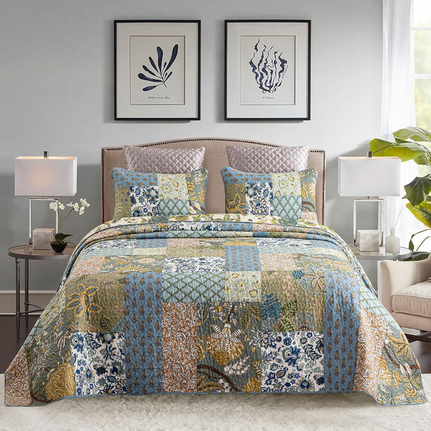 YAYIDAY Oversized King Bedspreads Patchwork Quilt Set (120x118 Inch) - 100% Cotton Reversible Breathable Green Leaves Quilted Coverlet with Pillow Shams for All Seasons