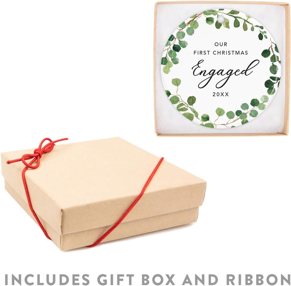 Andaz Press Custom Year Round Ceramic Porcelain Christmas Tree Ornament Keepsake Collectible Gift, Our First Christmas Engaged 2025, Farmhouse Eucalyptus Wreath, 1-PackCouple