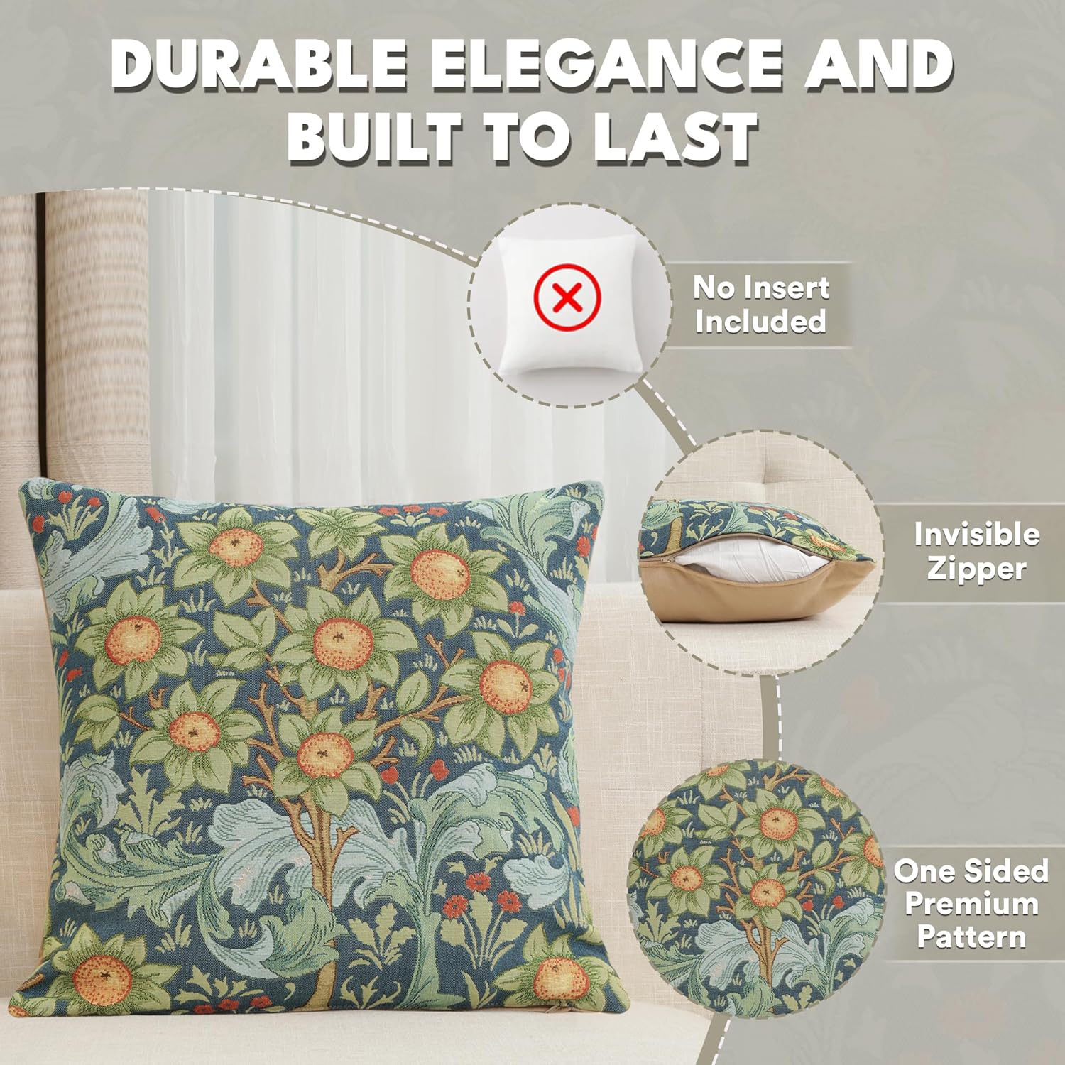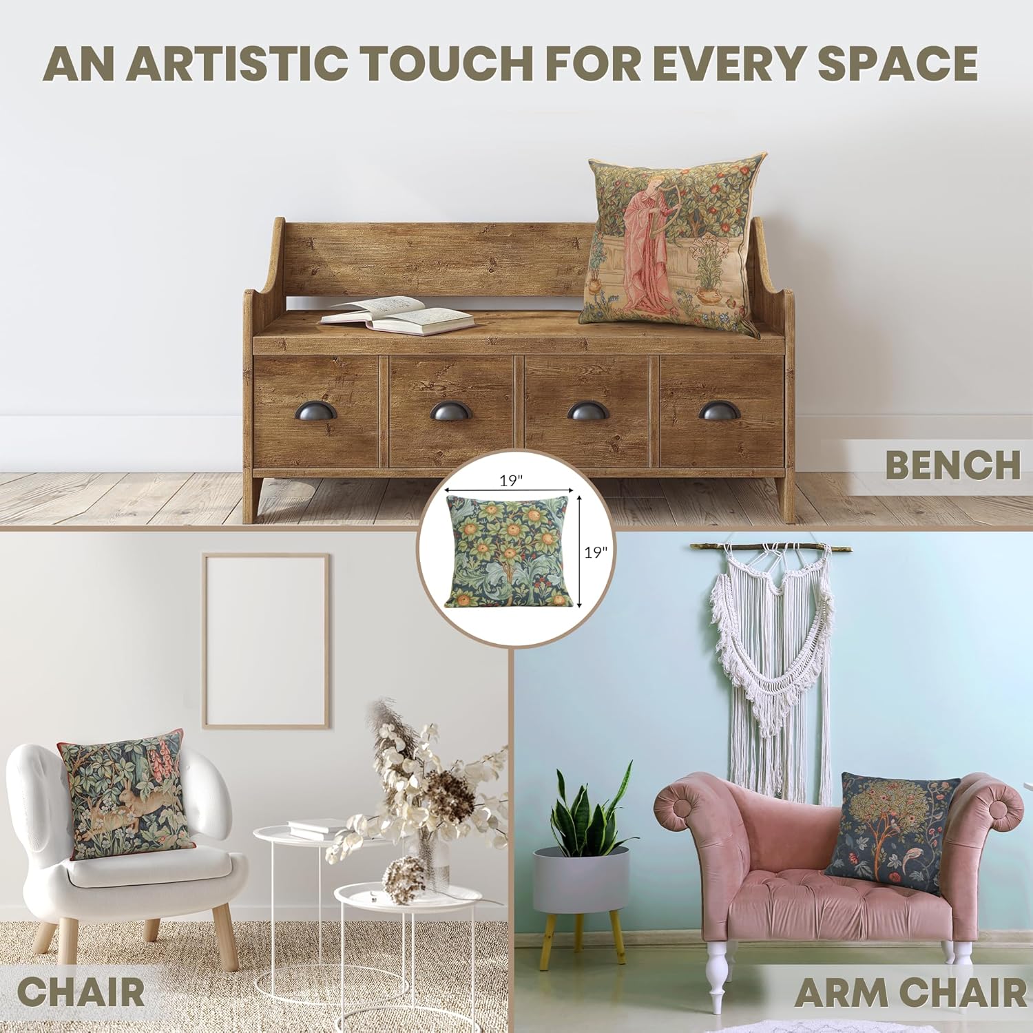 - Timeless Durability: Elevate your decor with our skin-friendly William Morris pillow covers 19”X19”, where quality and style come together. A sturdy hidden zipper ensures easy pillow insertion/removal, while the overlock stitches prevent seam ripping. Unlike thin printed cushion covers prone to tearing, our decorative pillows for couch with a super-soft backside are crafted with thick premium threads for long-lasting quality. THE PACKAGE INCLUDES A SINGLE TAPESTRY PILLOW COVER WITHOUT AN INSERT