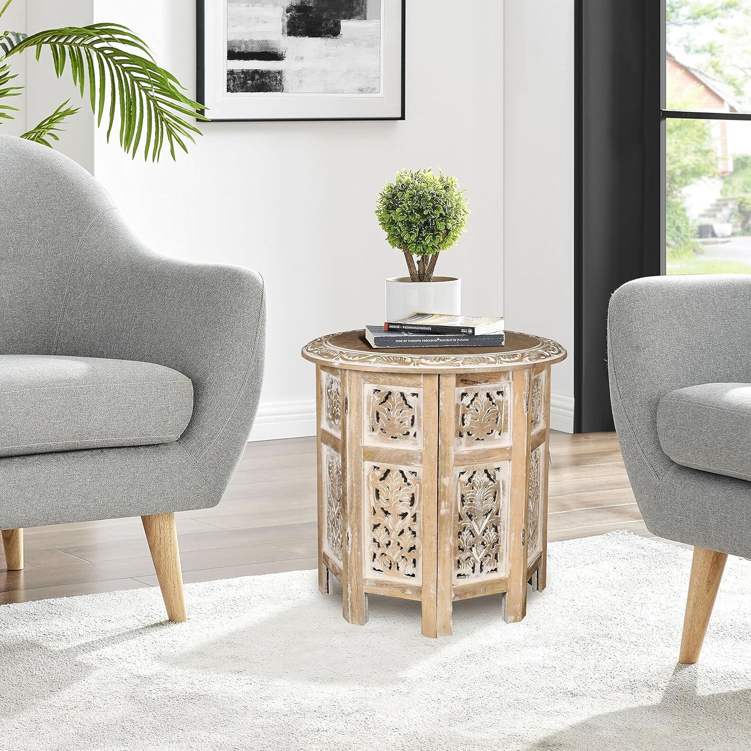 Lightnpro Hand Carved Solid Mango Wood Octagonal Accent Table - 18"×18" White Wash Farmhouse Vintage Home Décor Round End Table for Living Room, Bedroom, Entryway - Rustic Boho Side Table