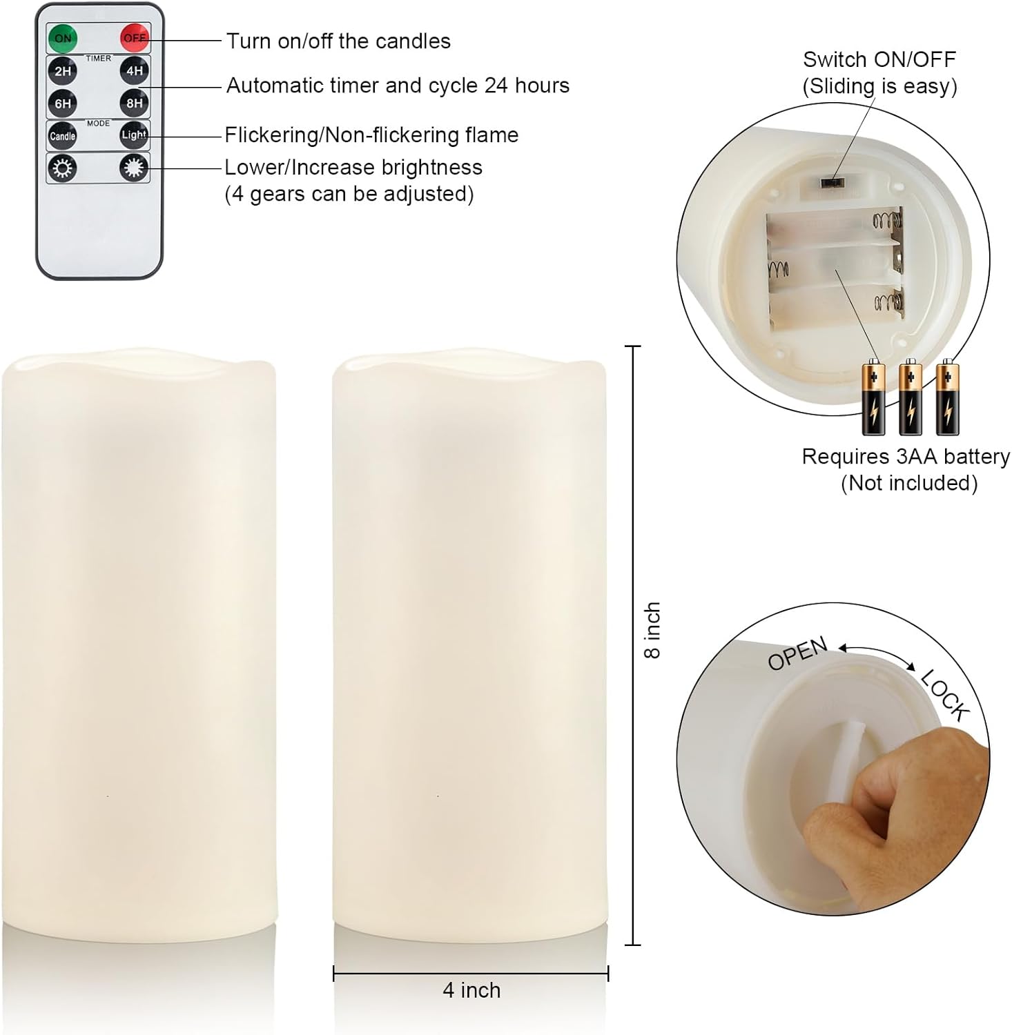 - Smart Remote Control and Long Last: The remote control provide a 2H/4H/6H/8H timer options, which will save your trouble to turn the timer candles on/off because they will come back on automatically at the same time every day. Also, you can adjust the light modes(flicker/steady glow) and brightness level as you want.