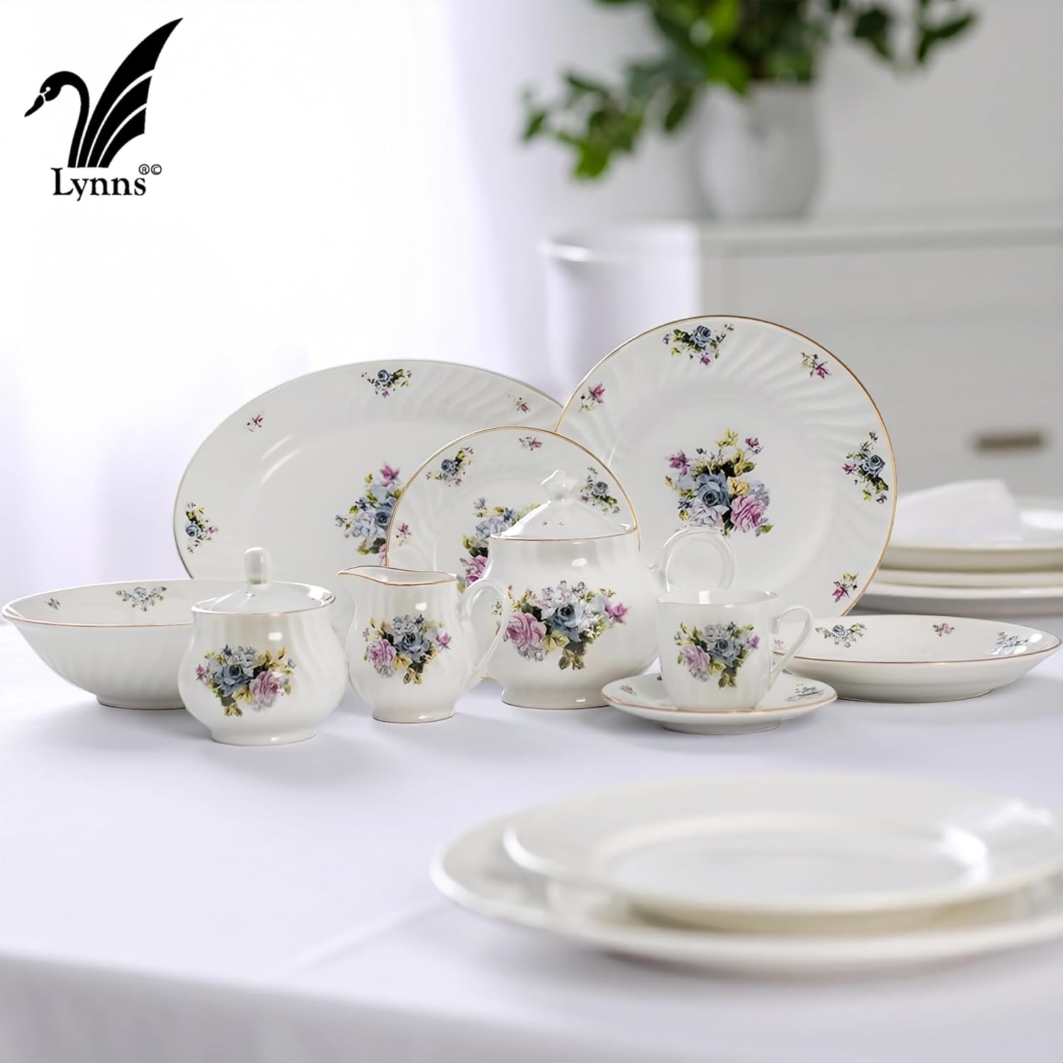 - White porcelain body. Each piece is shaped with a rippled swirl shape.