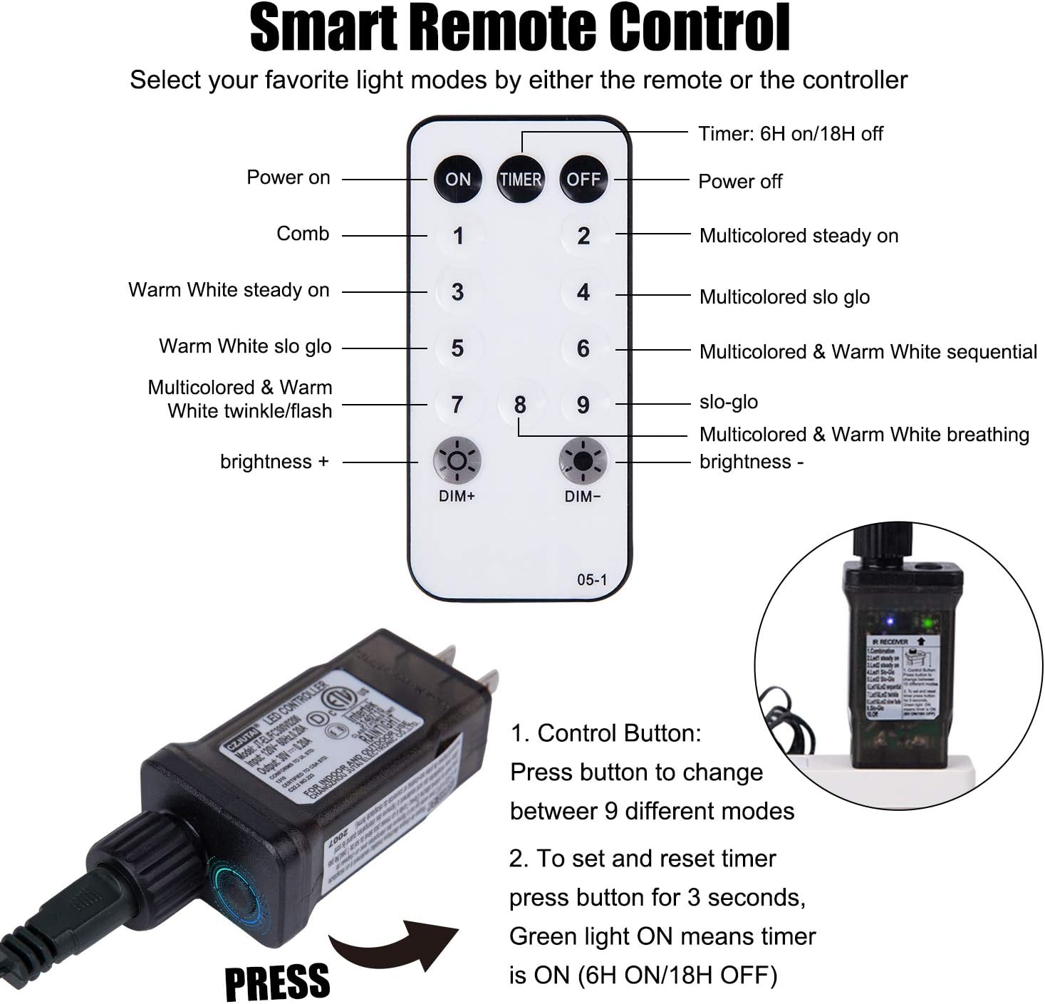 - Timer & Regulable Lighting & 8 Mode Lighting: These Christmas lights indoor have 100%-75%-50%-25% 4-level brightness and 6H on, 18H off time function. And the built-in memory chip will save your last mode setting, so there is no need to reset! These twinkle lights have 8 fun settings where you can choose various flickers or constant on option. These 360Âş sparkling warm white & multicolor lights can not only provide good lighting effects but also bring a more romantic festive atmosphere