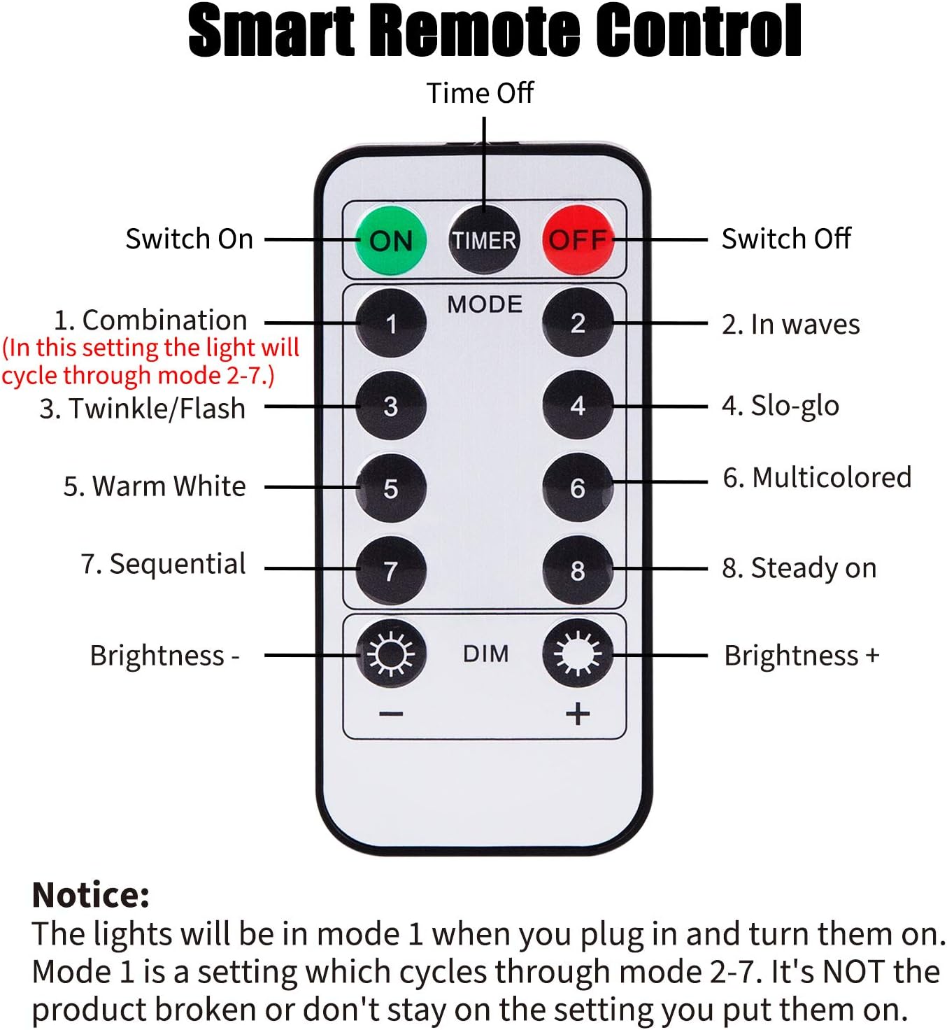 - Remote operation: Using the remote to turn on/off and control up to 16.4 Feet, press the TIMER button once to turn on for 6H lighting and turn off for 18H automatically every day. Press it again to cancel timer. Press the DIM - or + button repeatedly to set 4 level brightness. Press 1-8 button to switch to 8 amazing working modes