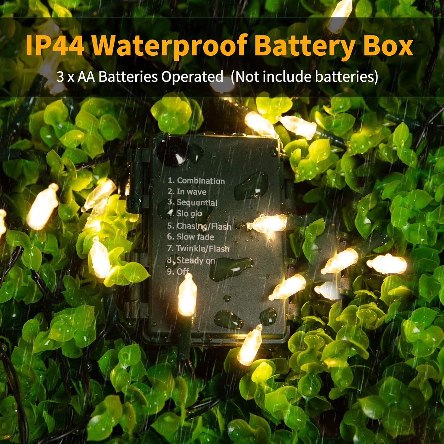 - Battery operated: 3 AA batteries (Not included) operated, 4 pack 18 feet 50 mini led strands, 3.9 inch lights spacing with compact water resistant battery control box, energy saving and eco friendly. Operation time depends on the running time and the quality of installed battery
