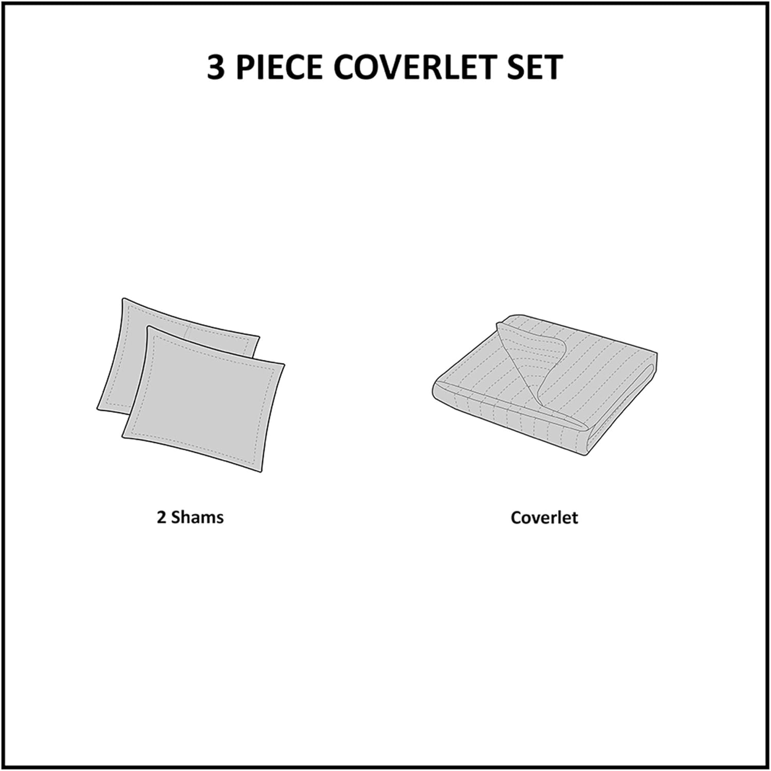 - Set includes: 1 Coverlet: 92"W x 96"L + 0.5"D, 2 Standard Shams: 20"W x 26"L + 0.5"D