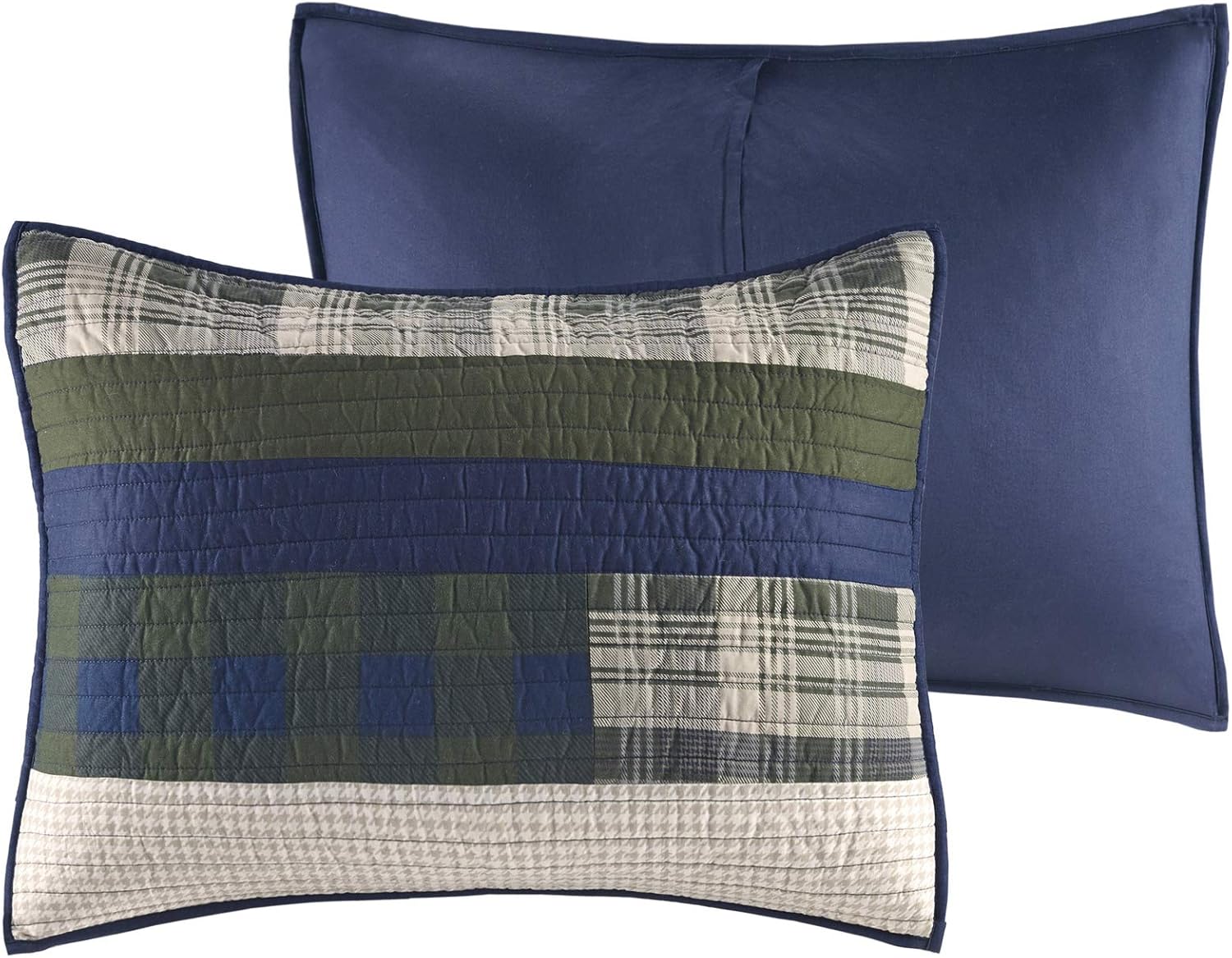 - The 100% cotton quilt features plaid pieced stripes in shades of green and blue and reverses to a solid blue color.