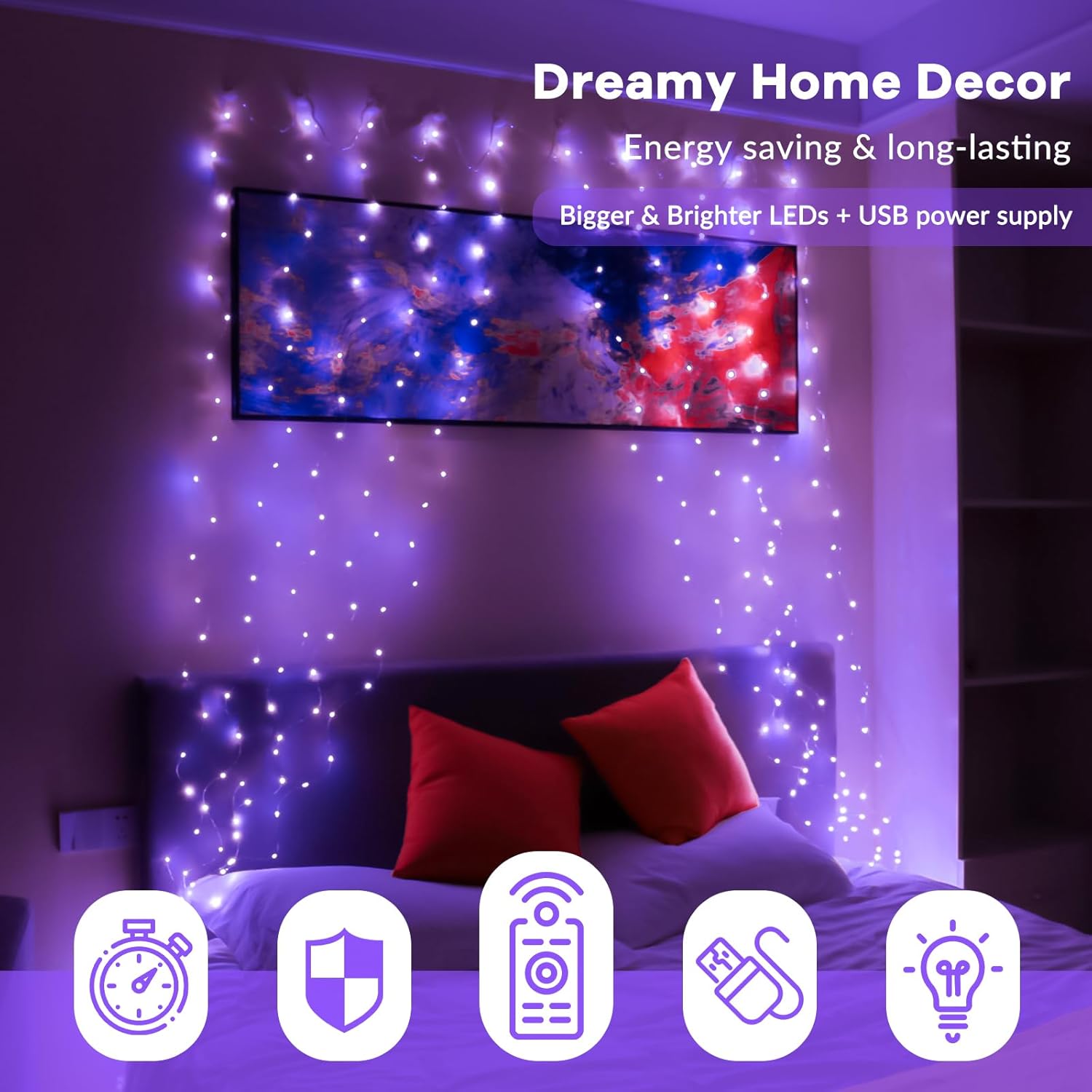 - 【Safety & Guarantee】: Operated with 5V LOW VOLTAGE, And will not get overheated, totally NO risk to cause any electric shock or fire hazard. Very Sturdy & supper safe to touch. Waterproof fairy lights Perfect for indoor and outdoor decorations: wedding, backdrop,party,home, window, wall, bedroom etc. Unravel easily with no tangles.