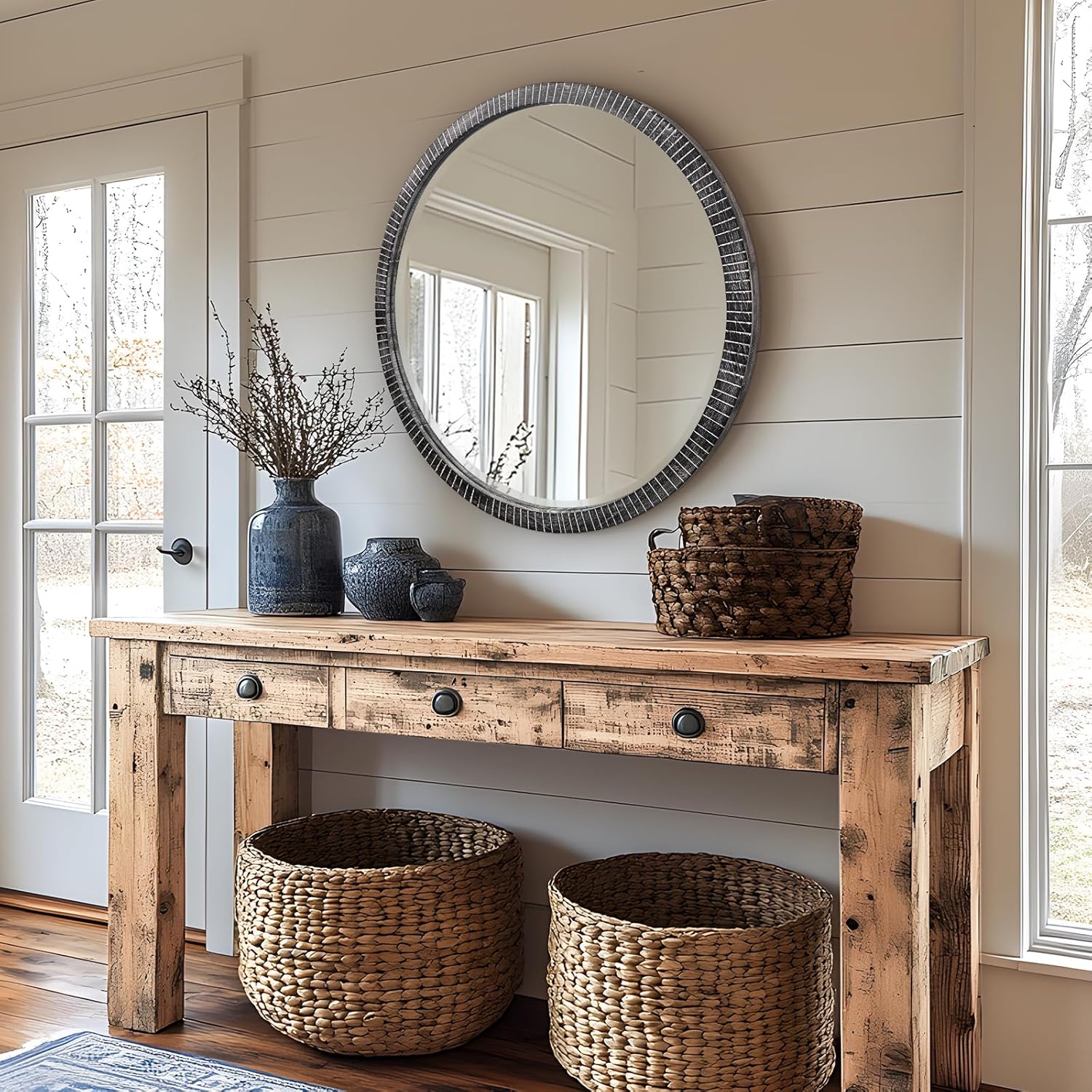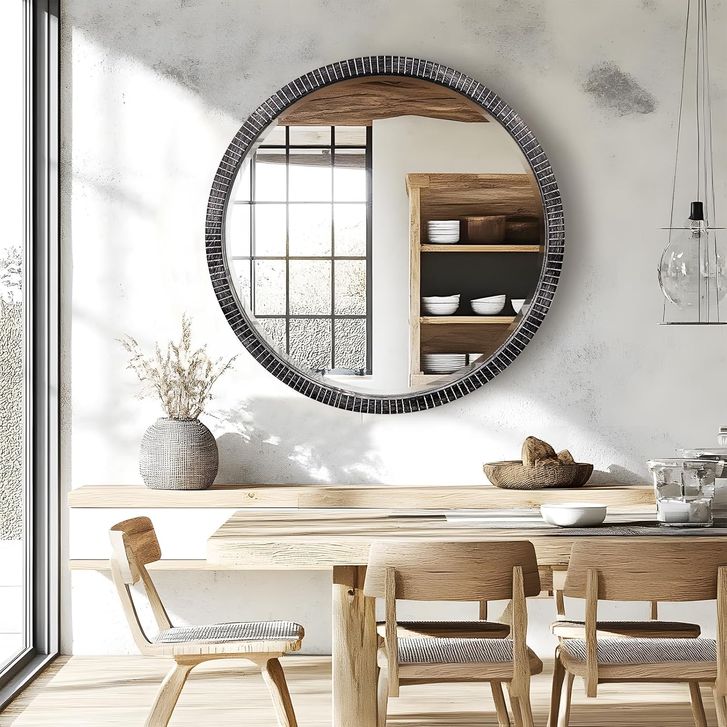 - NATURAL HOME DECOR: The element design of this round mirror 35 inches allows it to be integrated into any place and can add retro style to your home decoration. It can be used as a living room mirror, bedroom mirror, entryway mirror, or farmhouse wall decor. Provide a simple visual appeal to your room and be the perfect focal point for the entire room.