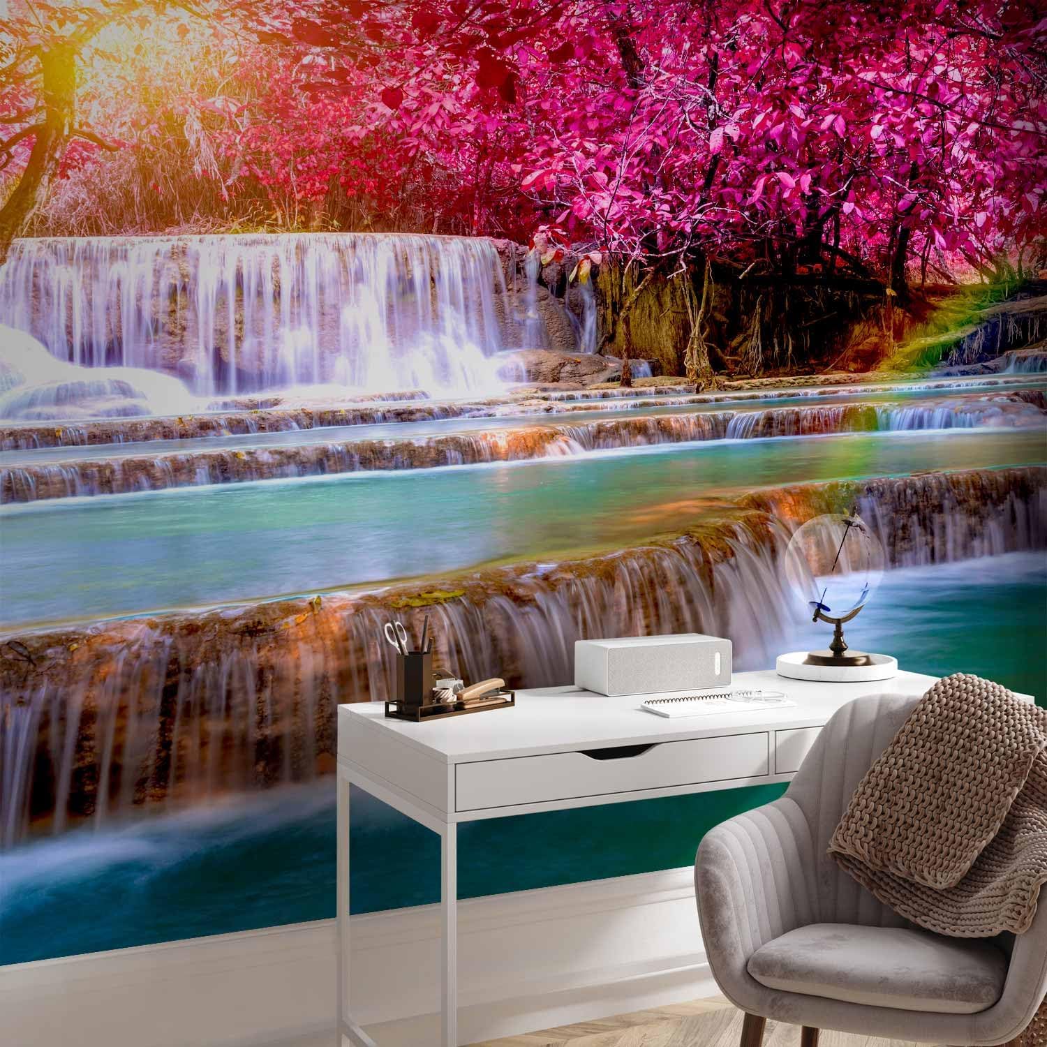 artgeist Wall Mural Peel and Stick Waterfall 212x98 in - XXL Self-Adhesive Corner Wallpaper Removable Large Sticker Foil Angle Wallpaper Wall Decor Print Nature Sun Pink Tree Forest c-B-0474-a-a