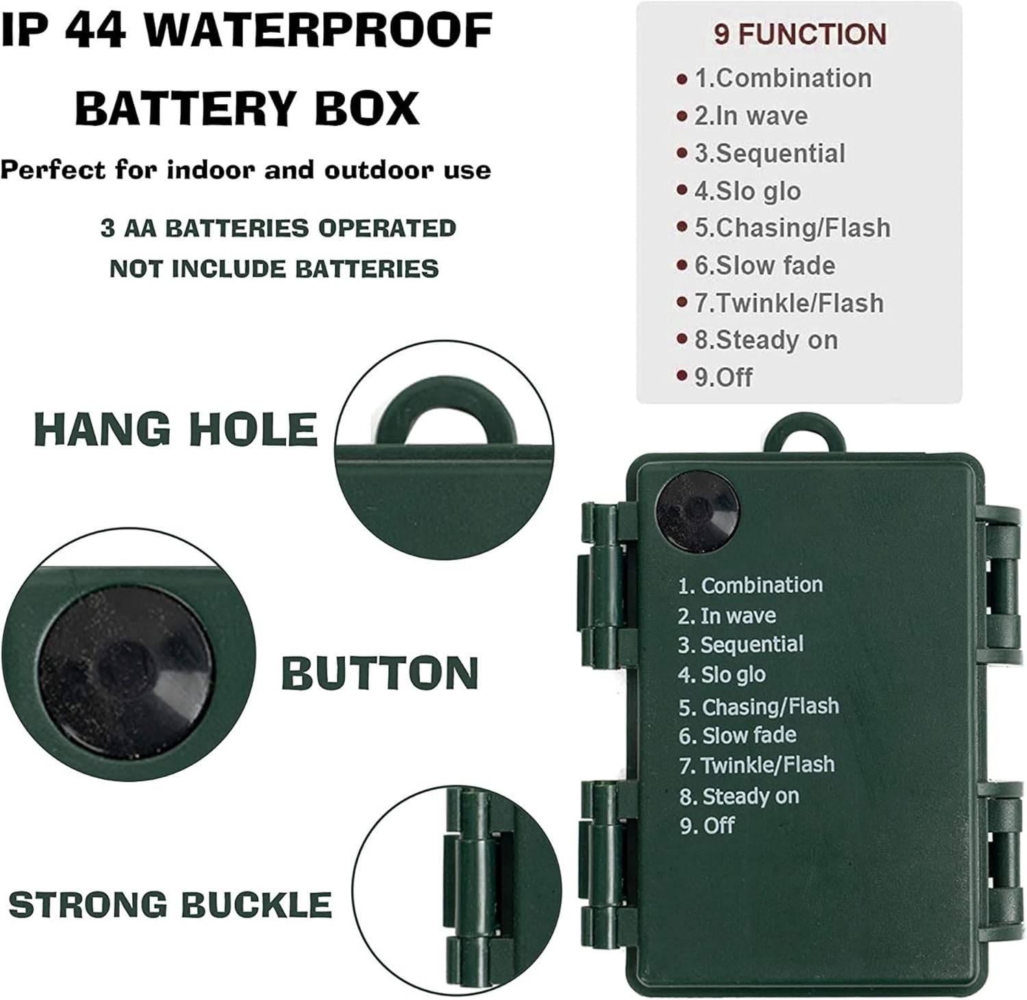 - Waterproof & Safety: Both the Battery box and fairty string lights are IP 44 waterproof. Perfect for outdoor festival Xmas decorations required. It won't over heat after long time working and is safety for touching, no danger to kids and pets. The sturdy bulb fits seamlessly with the socket to ensure a firm installation and will not fall during use.