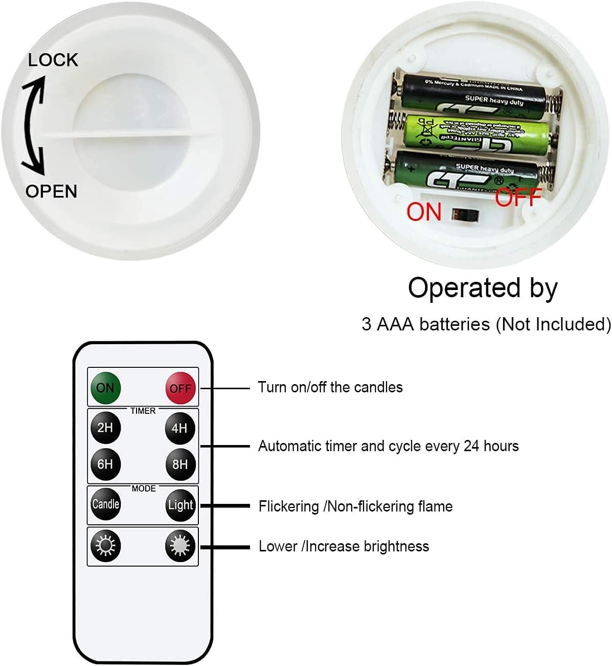 - 10-KEY REMOTE CONTROL AND TIMER: You will receive a 10-key remote control to all candles. You can set your candle on a 2 / 4 / 6 / 8 hour timer, adjust brightness, change flicker mode.