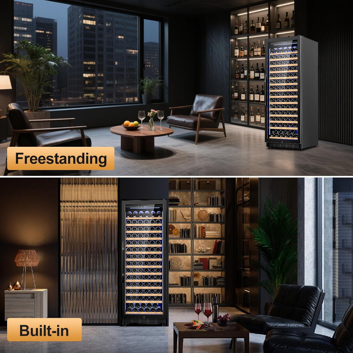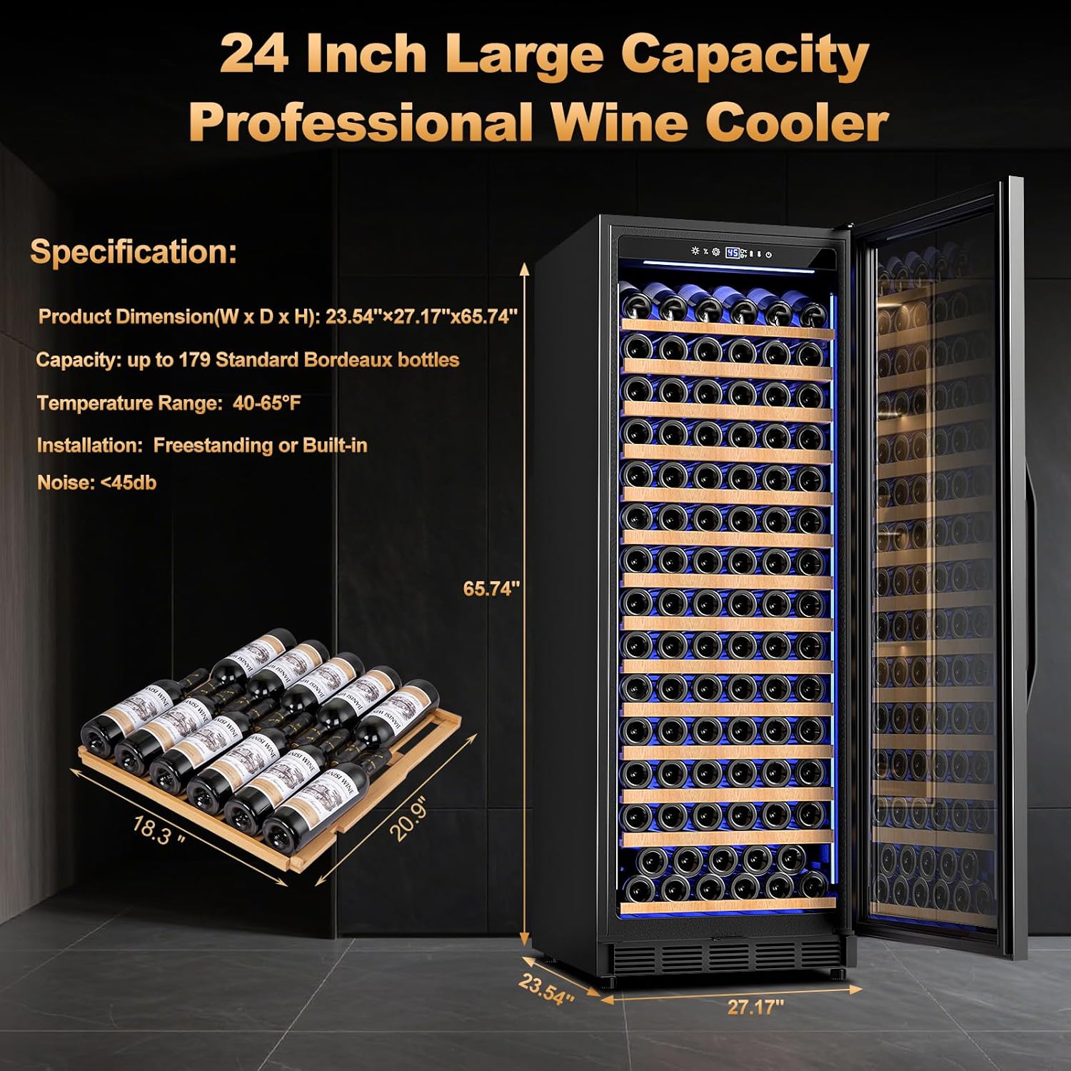 - 179-Bottle Large Capacity Storage:Our 24-inch wine chiller offers extraordinary space for your collection, accommodating 179 standard Bordeaux bottles. The removable wooden shelves with smooth side rails keep bottles organized and easily accessible, while the top display shelf with bottle holders elegantly showcases your finest vintages