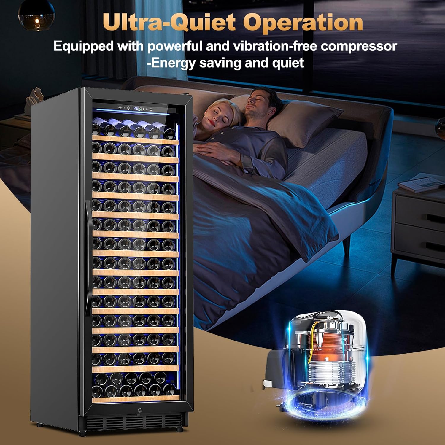 - Whisper-Quiet & Energy Efficient Operation:Engineered with a highly soundproof compressor, this wine refrigerator operates at a quiet ≤38dB. The energy-saving technology reduces power consumption while the high-density door seal maintains consistent temperature