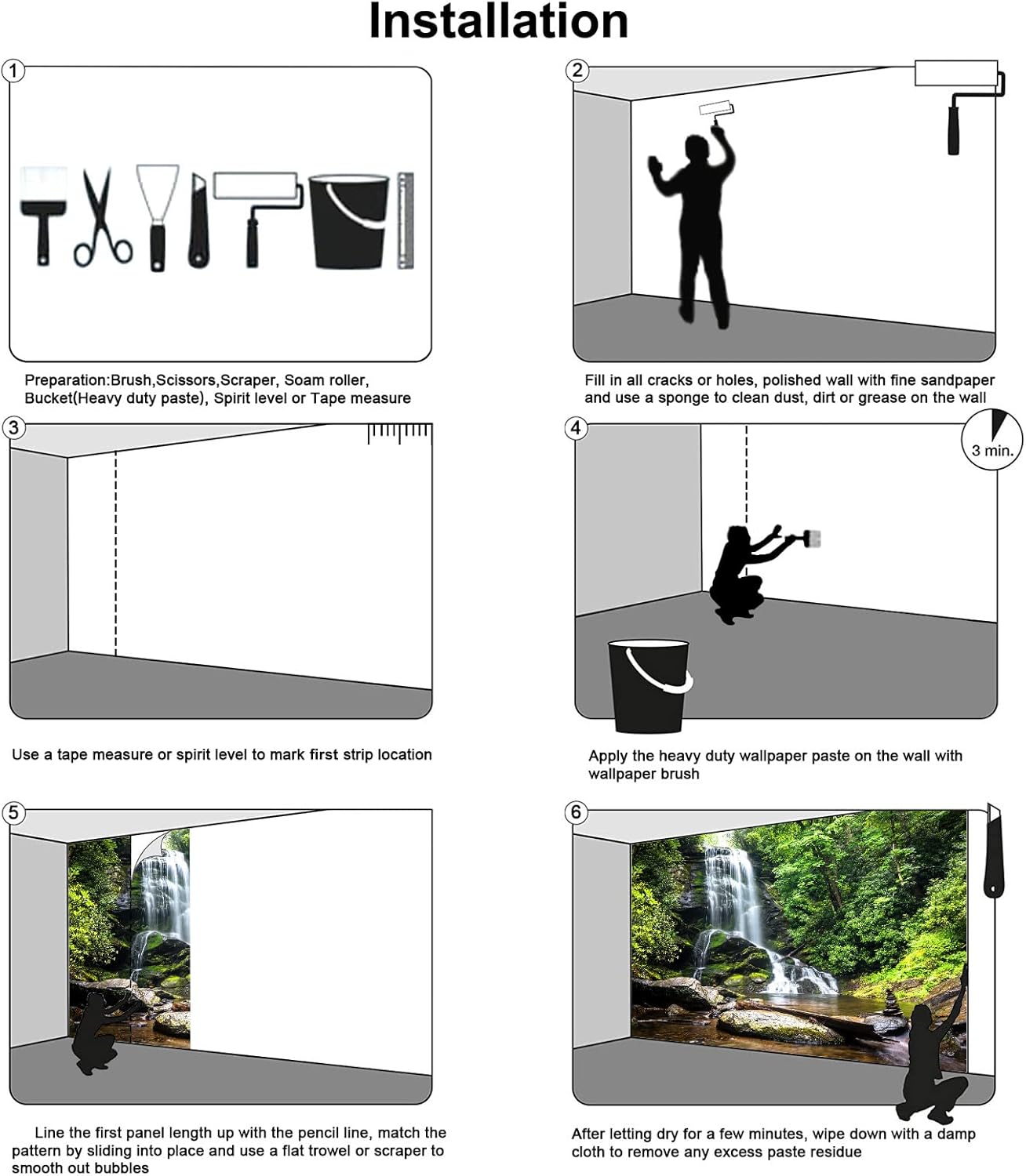 - Easy Installation 1.Fill in all cracks or holes and clean dust dirt and grease on the wall surface. 2. Apply the heavy duty wallpaper paste on the wall not mural. 3. Use a spirit level to mark each strip location. 4. match the pattern by sliding into place. 5.use a scraper to smooth out bubbles press. 6. Let dry for a few minutes and that's it! Please Note: Not self-adhesive. We recommend to use a standardized fleece wallpaper paste.