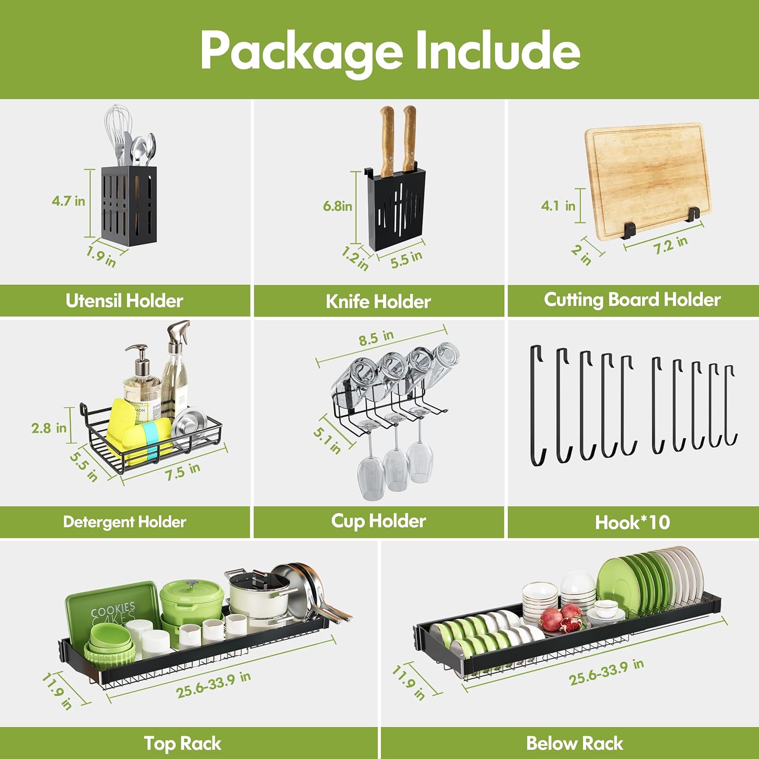 - đź§ş Multi Level Storage Efficiency: Three spacious tiers organize dishes by type, large cookwares on top, bowls and plates in the middle, while dedicated sponge holder and hanging hooks keep sponges and brushes accessible. The dish rack over sink open grid design accelerates drying by promoting airflow, reducing water spots