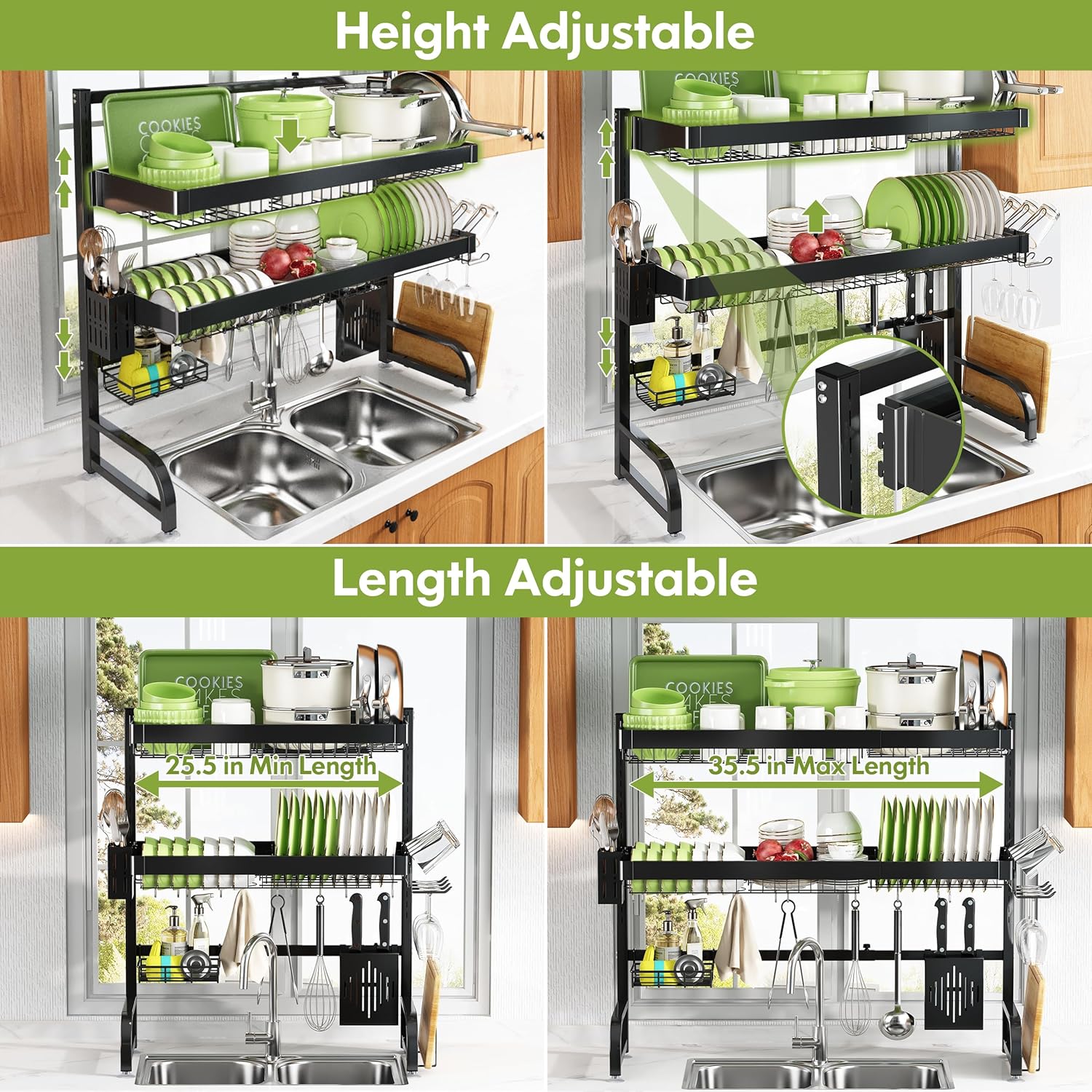 - 🔄 Expandable Design for Custom Fit: Adjust the over sink dish drying rack width effortlessly to span most standard single or double sinks, adapting seamlessly to your kitchen layout. The dish drain modular design allows rearranging tiers and accessories to prioritize space for tall glasses, wide pans, or cleaning tools, maximizing vertical storage above the sink