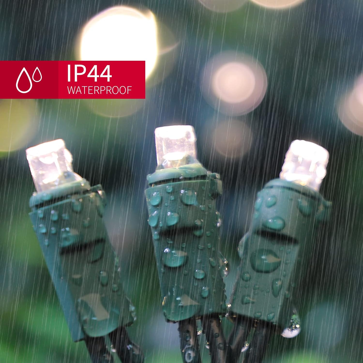 - 5mm LED Christmas Lights: 100 counts warm white 5mm wide angle stable LED string lights spaced 6.3 inches apart with green wire. 7.1 inch leads have a stackable male plug and 5.9 inch tails have a female plug for easy end to end connection.