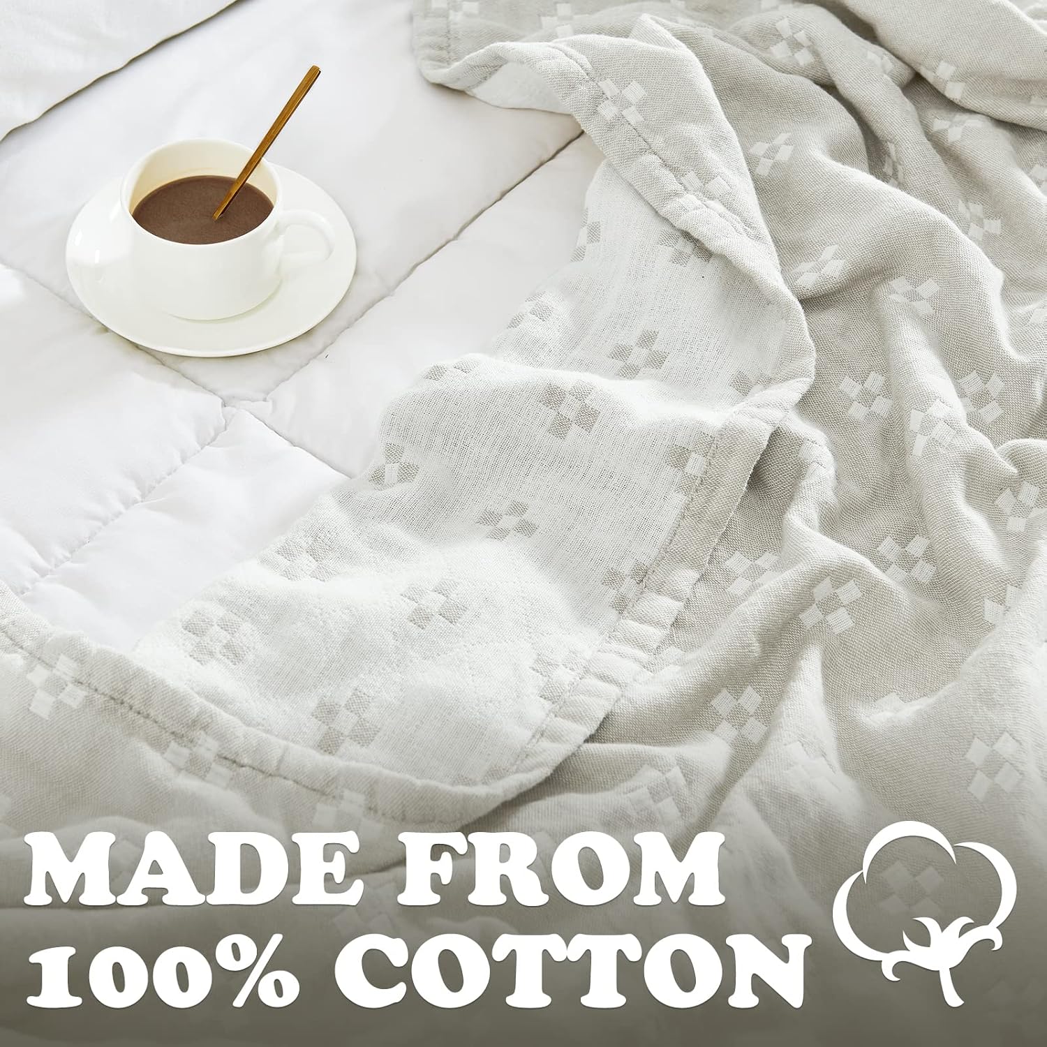 jinchan Boho 100% Cotton Blanket Muslin Twin Size 60x80 Inches Lightweight 3-Layer Geometric Cross Pattern Reversible Quilt Throw Soft Breathable Comfy All Seasons for Couch Bed Decor, Light Grey
