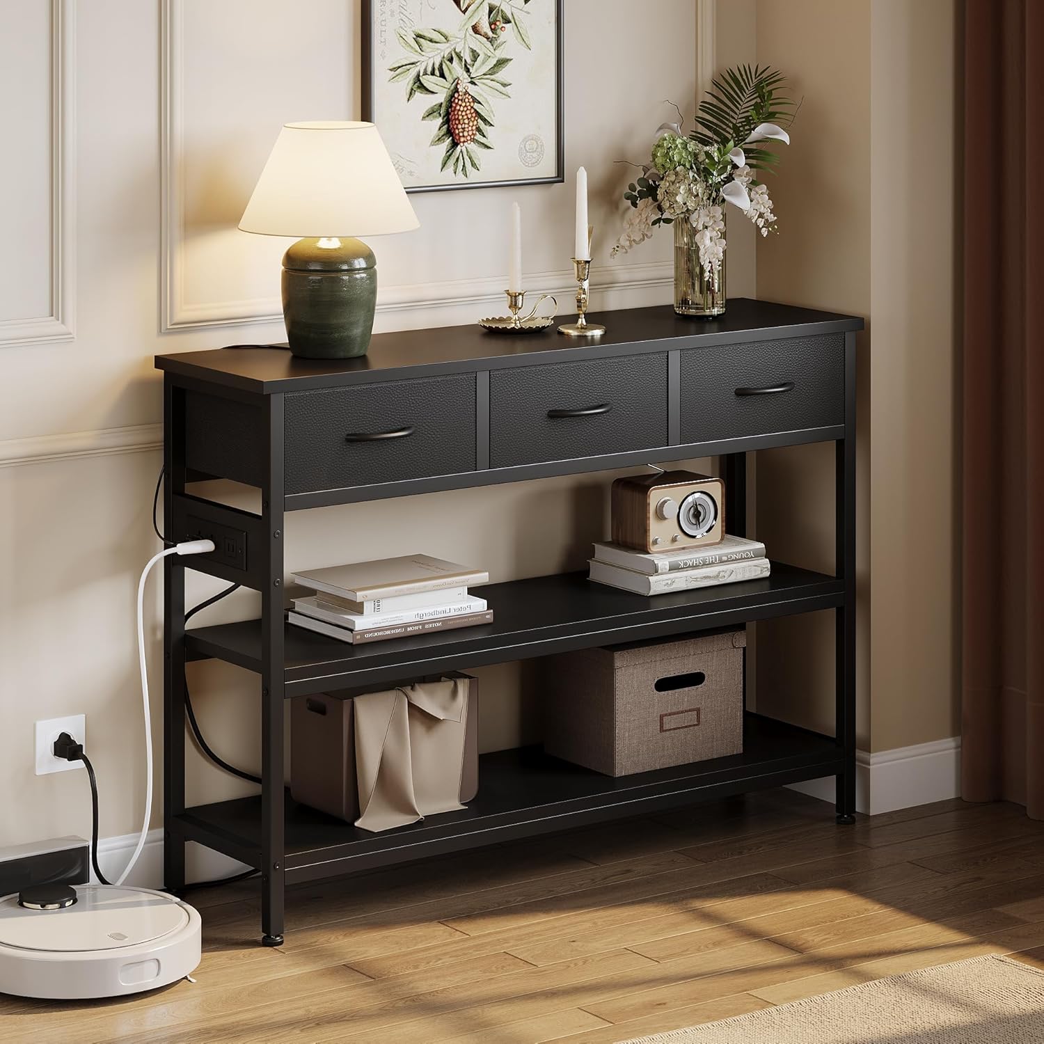 Lulive Entryway Table with Power Outlets, Console Table with 3 Fabric Drawers, Sofa Table for Living Room, Hallway, Couch, Foyer, Height Adjustable (Black, 43")