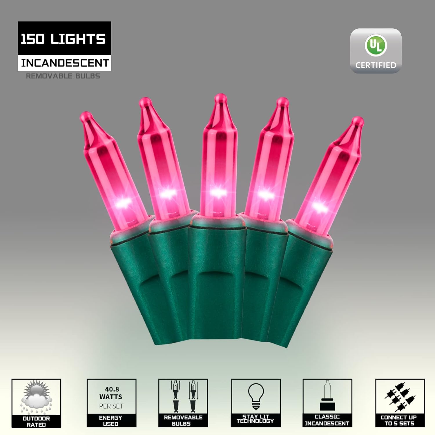 - Safty and Easily: High quality UL certified products ensure the safety of you and your family, Decorate with 150 pink incandescent mini lights with green wire will give a soft festive feel to your Christmas.