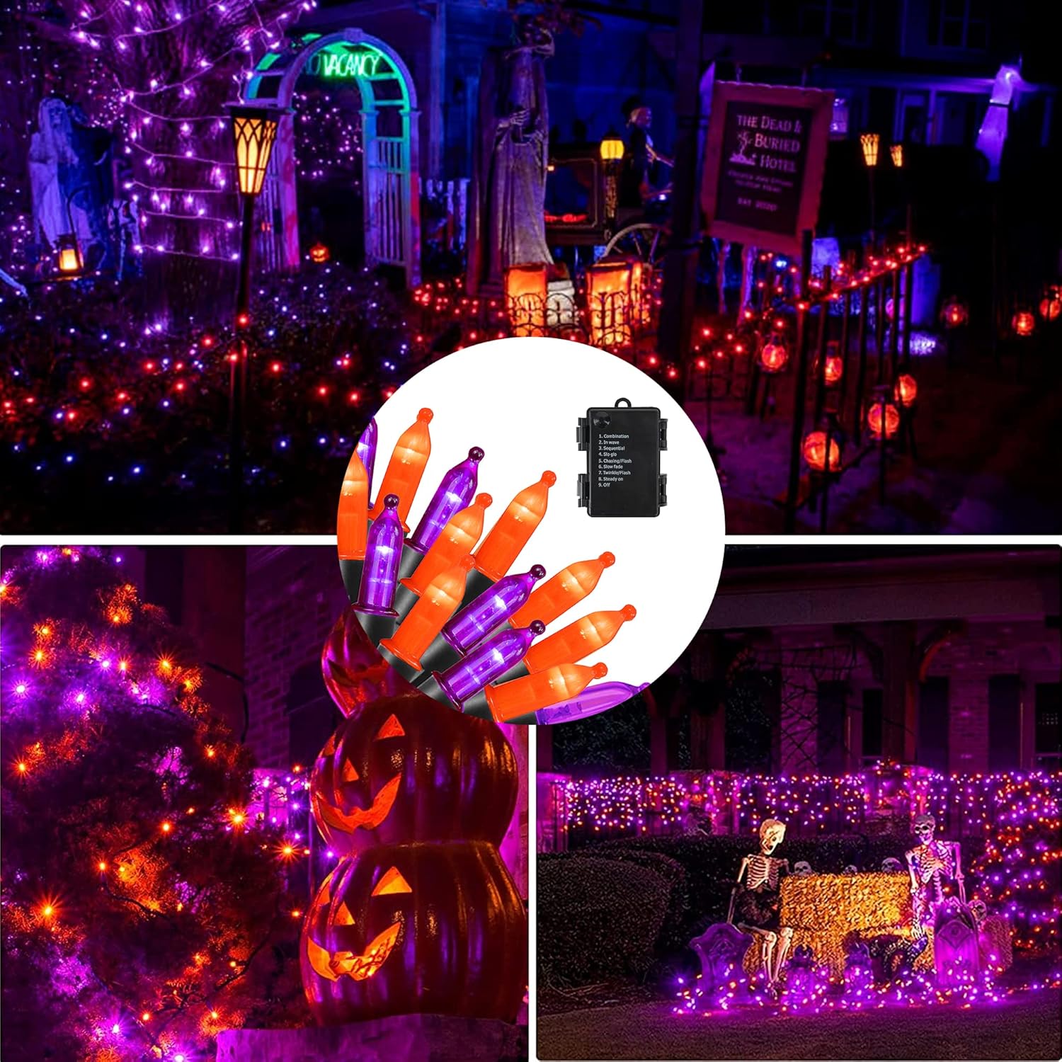 Dazzle Bright Purple and Orange Halloween Lights Battery Operated, 2 Pack Total 100LED 32FT Waterproof Mini String Lights with 8 Modes, Halloween Decorations for Outdoor Indoor Garden Yard Party
