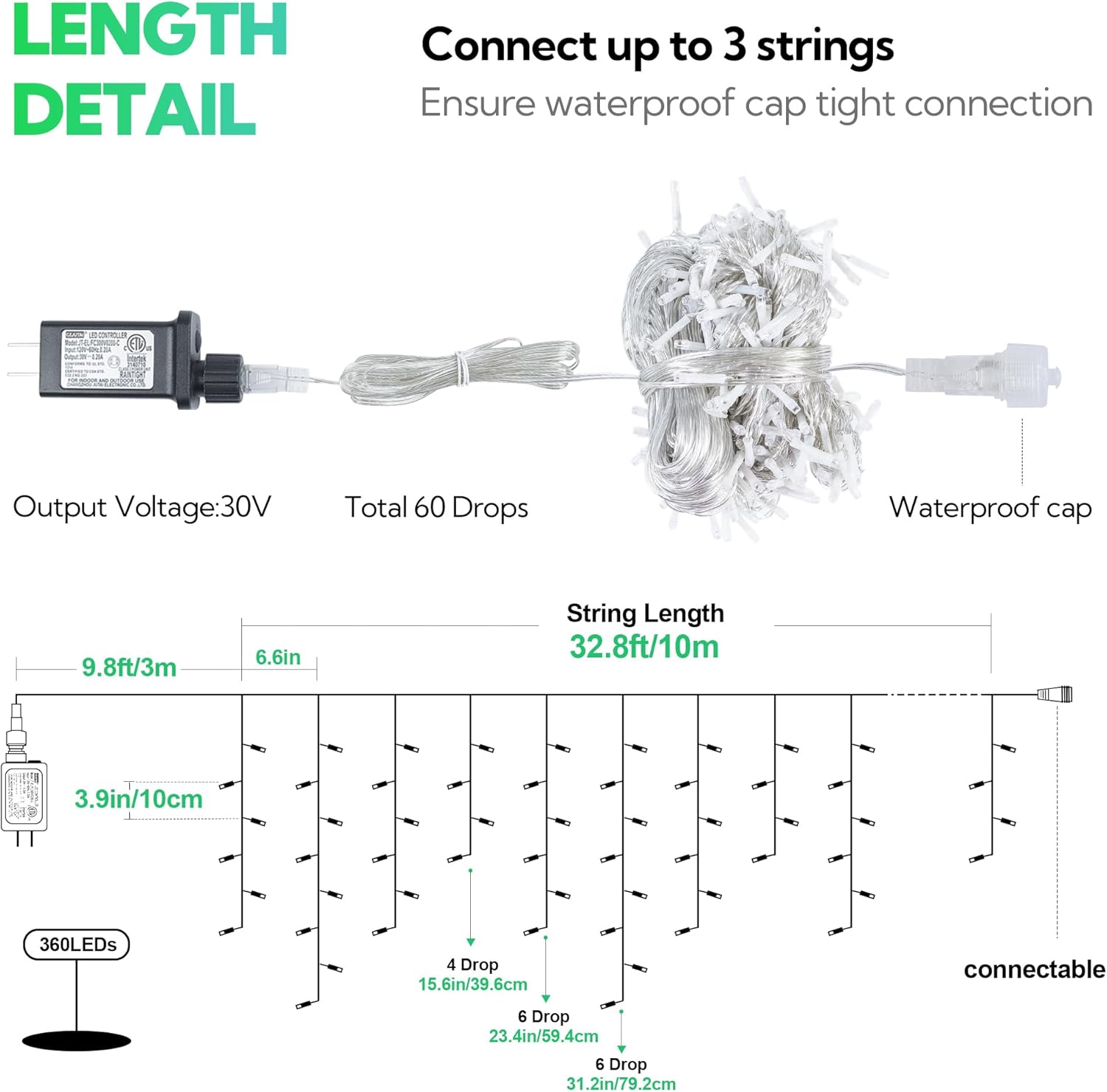 - 💗【Connectable for Wide Use】: Our icicle Christmas lights adopt 360L bright led bulbs,42.6ft/ 13m long in total with total 60 drops.Drop lengths 16''- 24''- 31''- 24'', number of light bulbs is 4, 6, 8, and 6 respectively. The outdoor string lights is extendable,can maximum connect with 3 sets.clear wire looks simple but dreamy.You can hang them on roof, hedge, fence, prom, patio, eave, handrail etc, creating romantic atmosphere for wedding,party,Valentine's Day,Christmas,New Year.