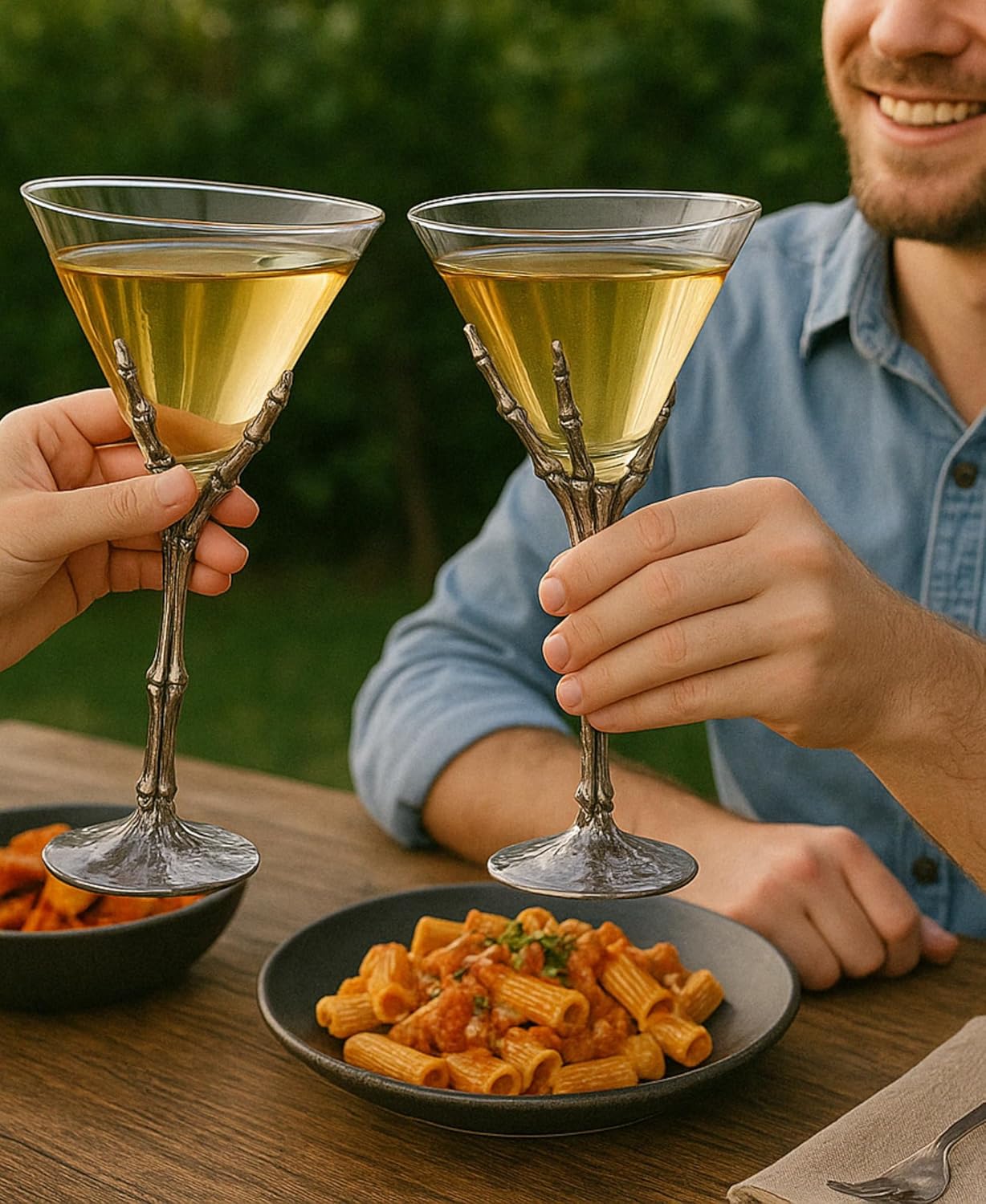 Stemmed Skeleton Martini Glasses Set of 2 – 9" Gothic Skeleton Hand Cocktail Glasses – Spooky Halloween Barware for Drinks, Wine & Martinis – Goth Party Decorations, Skeleton Gifts & Unique Glass Set