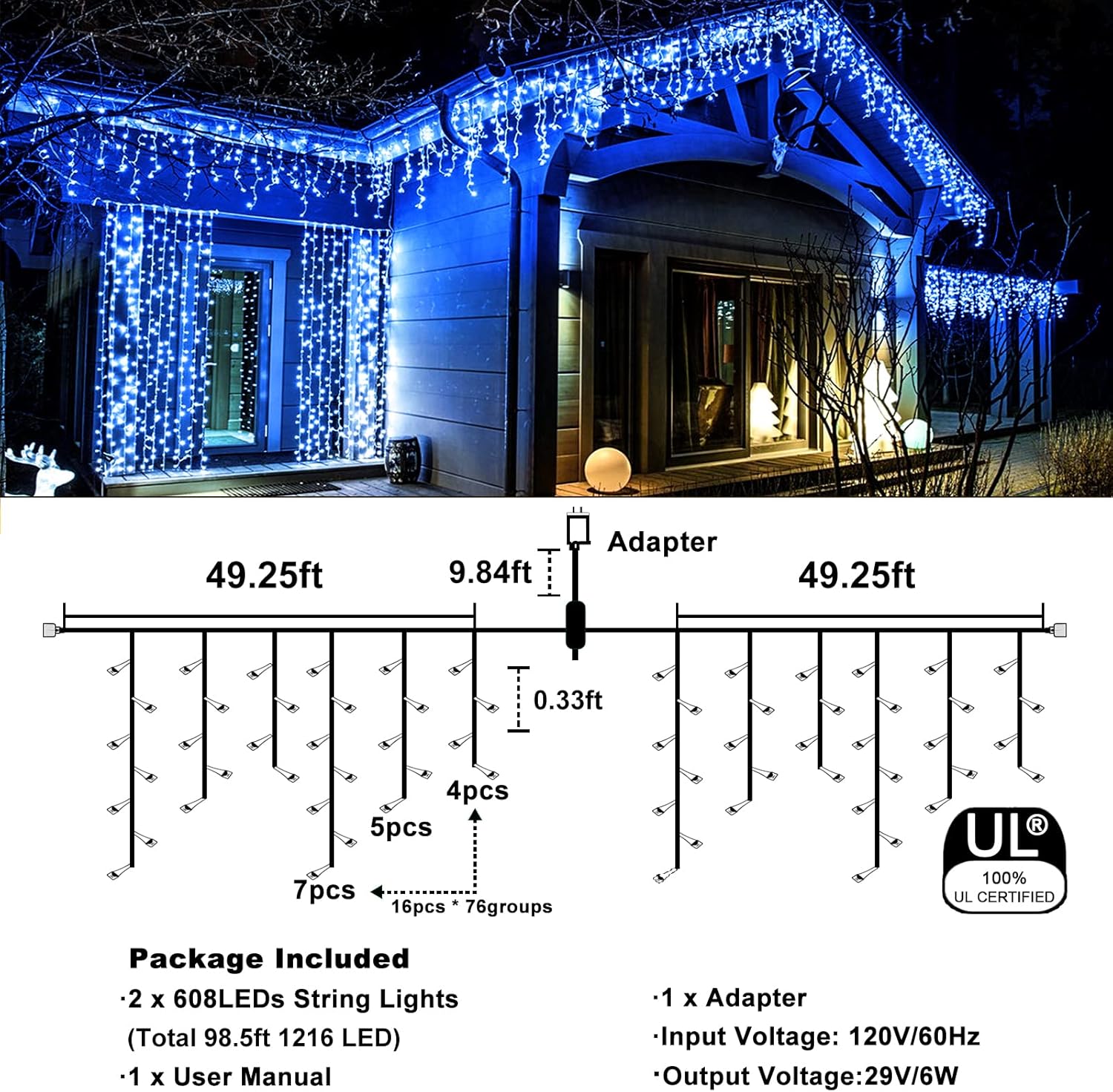 - [IP44 Waterproof & UL Certified] - These icicle Christmas lights are equipped with a safe 29V low voltage UL certified plug and robust clear wire that can better avoid overheating which is corrosion resistant, aging resistant. IP44 waterproof design make the lights are suitable for use even in rainy or snowy. Perfect decoration for Christmas, Hallwen party, wedding, home, festival, holiday, shows, restaurant, hotel, shopping mall etc.