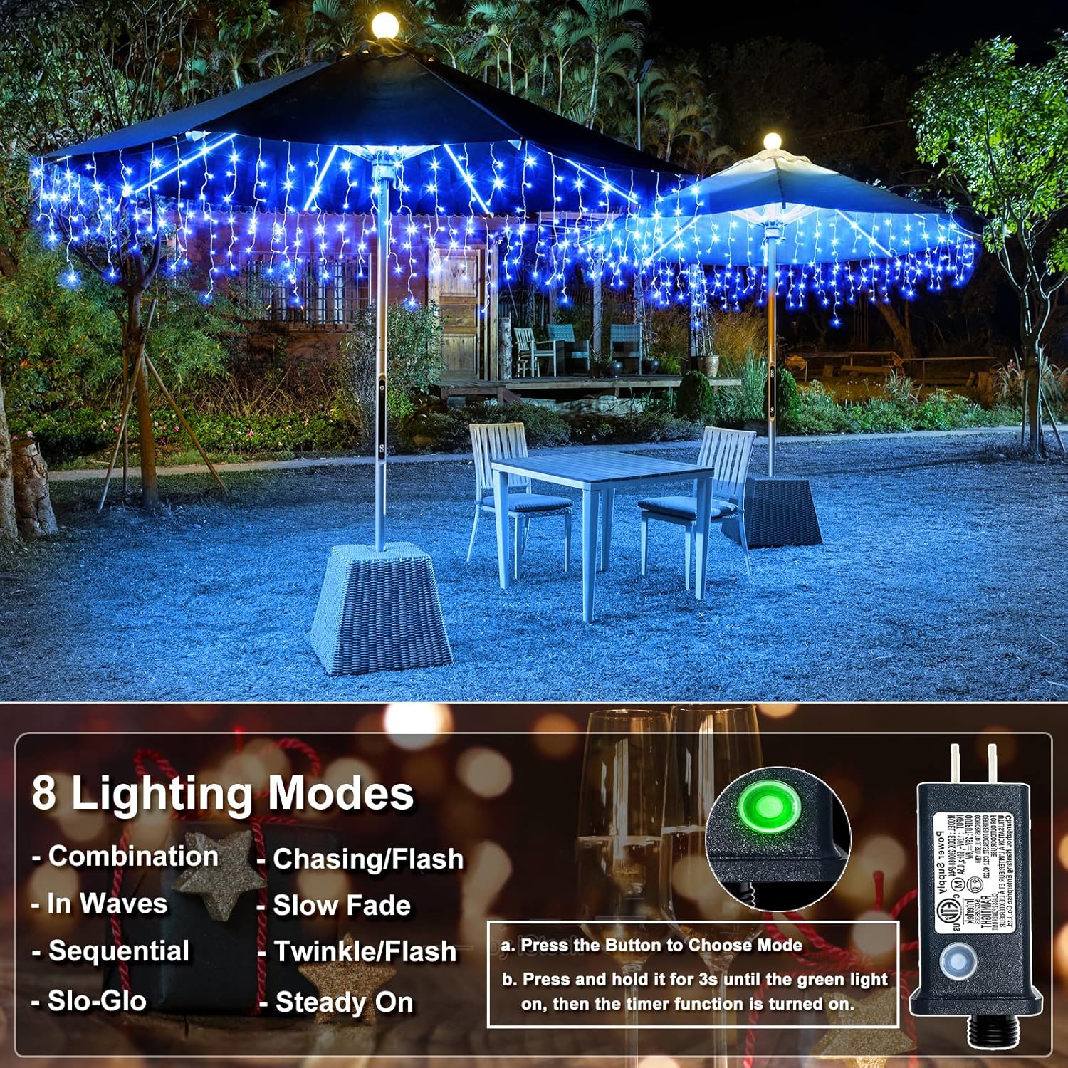 - [8 Modes Twinkle Lights] - The curtain lights has 8 different lighting modes for you: 1.Combination, 2.In Waves, 3. Sequential, 4.Slo-glo, 5.Chasing/Flash, 6.Slow Fade, 7.Twinkle/Flash, 8.Steady On. Different lighting modes controlled by only one button, directly plug in and unplug the controller for power on and off. You can easily to hang the icicle lights outdoor on the eaves, patio, garage, top of hall, balcony, wedding or anywhere you want.