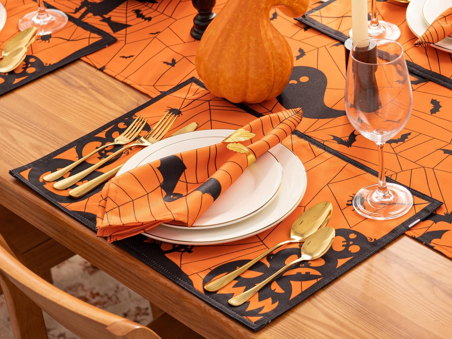 - ADD A CREEPY FINISHING TOUCH: This printed placemat is the perfect addition to decorate your tabletop for Halloween parties; The black haunted house design and hanging bats and spider web over the orange placemat make a cute, festive decoration.