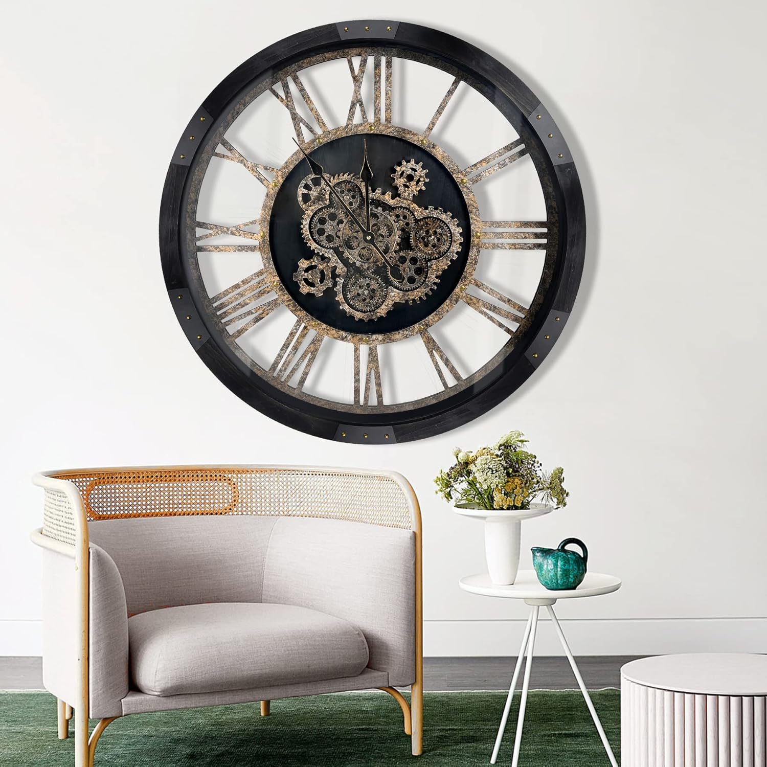 - đ§ăReal Moving Gears Wall ClockăThe large rustic wall clock is design with multi-real moving gears, put battery in, various gears start working, makes a subtle relaxing sound and makes a living element in the environment in where it is placed, vintage and magical, catch all eyes of visits.