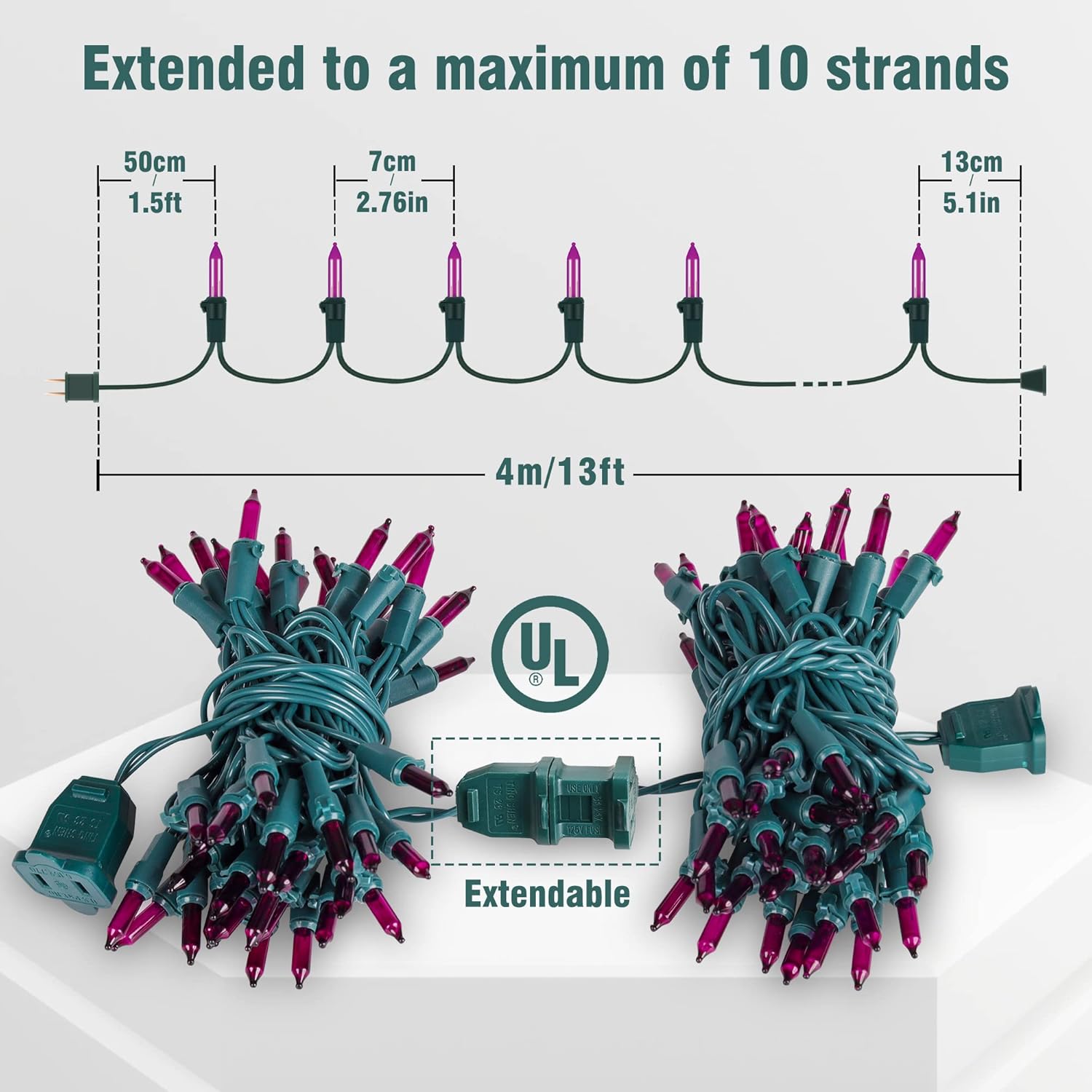 - đź”®ALWAYS ON String Lights:This is a set new purple always on Christmas lights,when one or more bulbs in the string fall off or are damaged, the rest will stay lit without affecting others string lights brightness or longevity.For more assurance,each string with extra 4bulbs and 4fuses for replacement, no worry about bulbs burn out or overload.