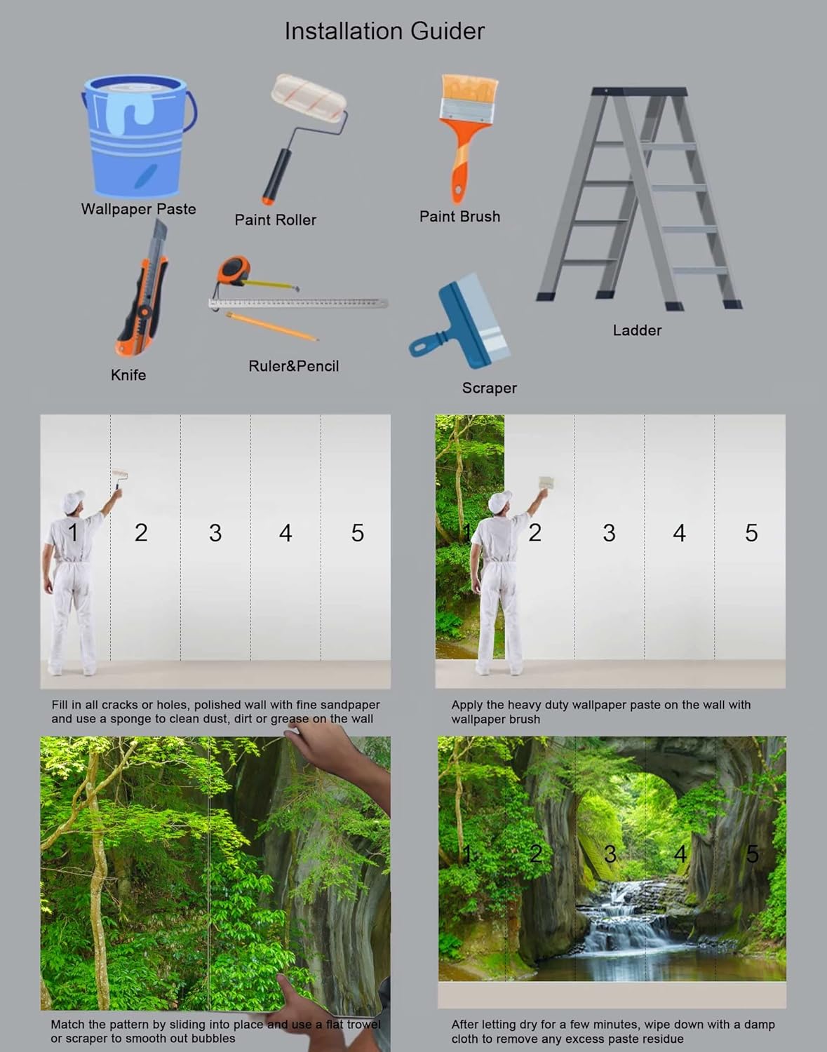 - Easy Installation 1.Fill in all cracks or holes and clean dust dirt and grease on the wall surface. 2. Apply the heavy duty wallpaper paste on the wall not mural. 3. Use a spirit level to mark each strip location. 4. match the pattern by sliding into place. 5.use a scraper to smooth out bubbles press. 6. Let dry for a few minutes and that's it! Please Note: Not self-adhesive. We recommend to use a standardized fleece wallpaper paste.