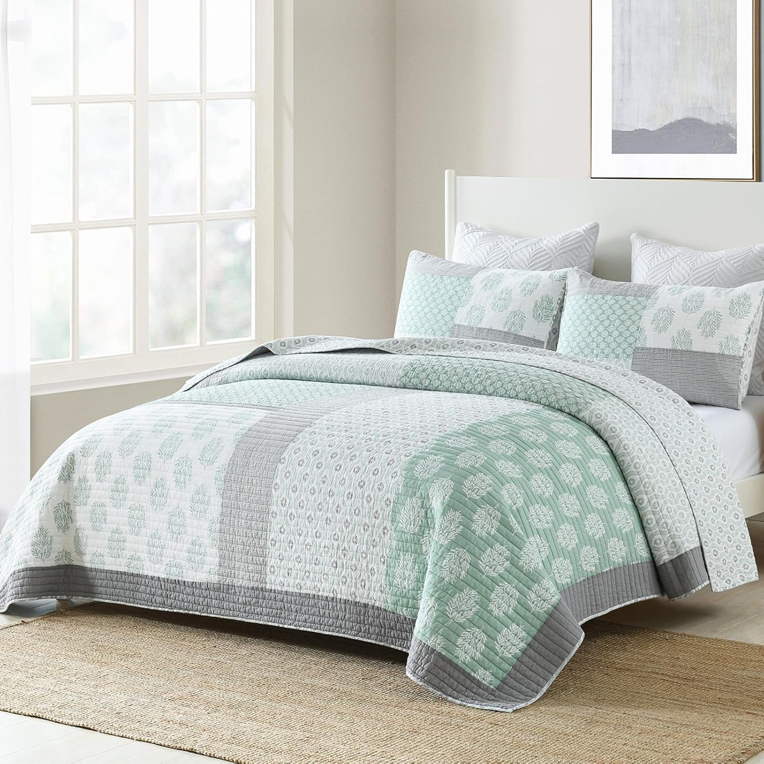 PANGUSHAN Quilt Set Queen Size, 100% Cotton Bedspread Quilt Bedding Set, Patchwork Reversible Floral Quilt for Queen Bed, Green/Grey/White Bed Spread, Lightweight Comforter for All Season, 3 Pieces