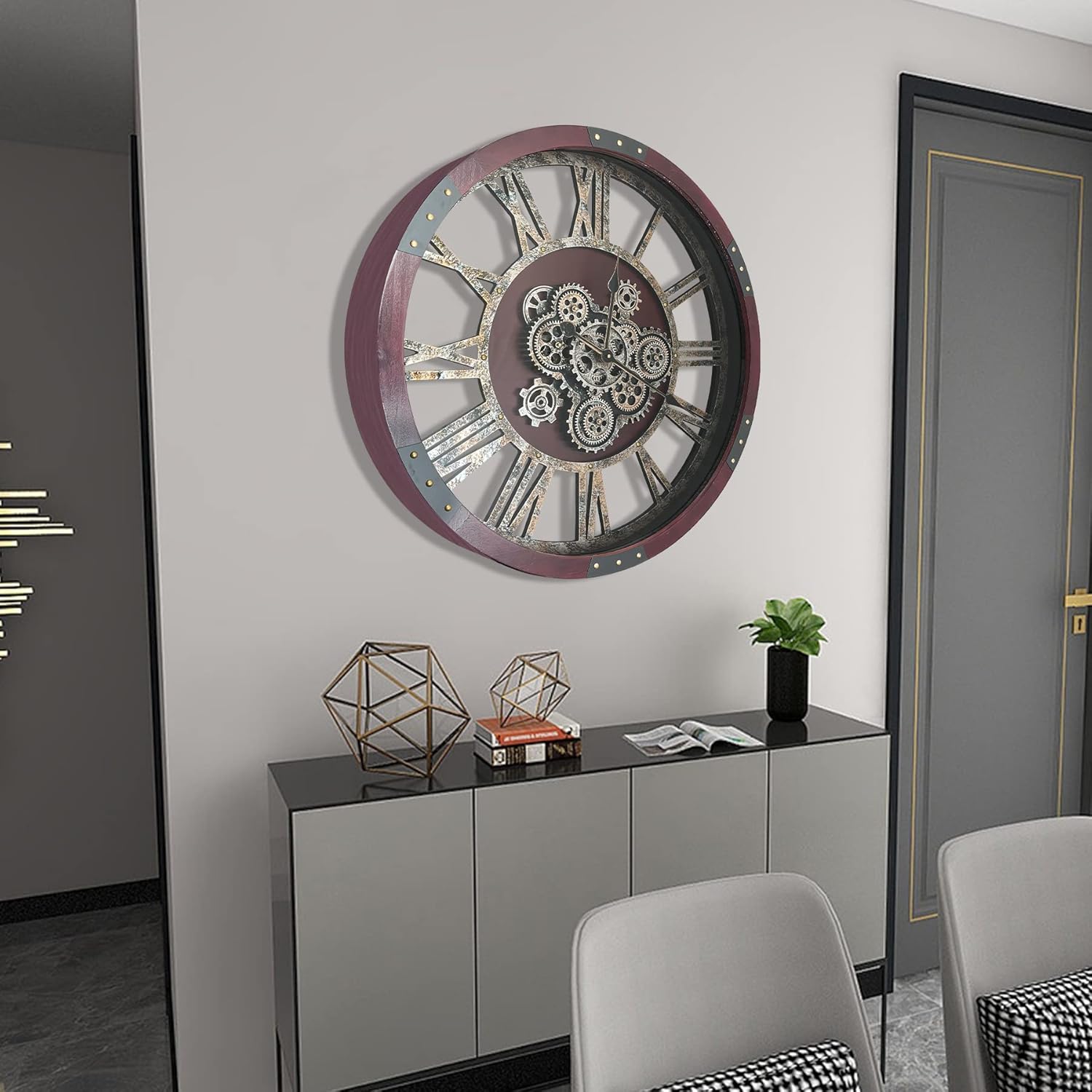 - đ§ăReal Moving Gears Wall ClockăThe rustic wall clock is design with multi-real moving gears, put battery in, various gears start working, makes a subtle relaxing sound and makes a living element in the environment in where it is placed, vintage and magical, catch all eyes of visits.