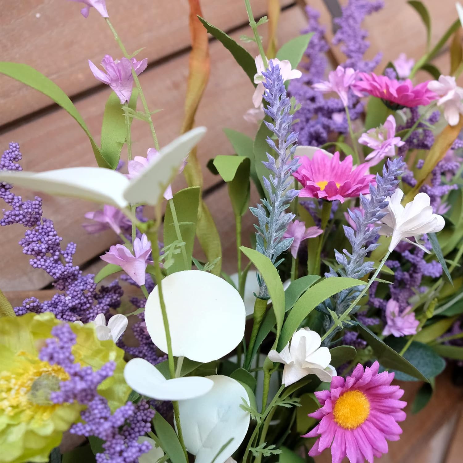 - [Spring Artificial Flower Front Door Wreath] More than three kind of different green leaves match four kinds of different spring fresh and life looking wild flowers. This front door wreath will give your door much more energy and vigor. Good choice for Spring decor.