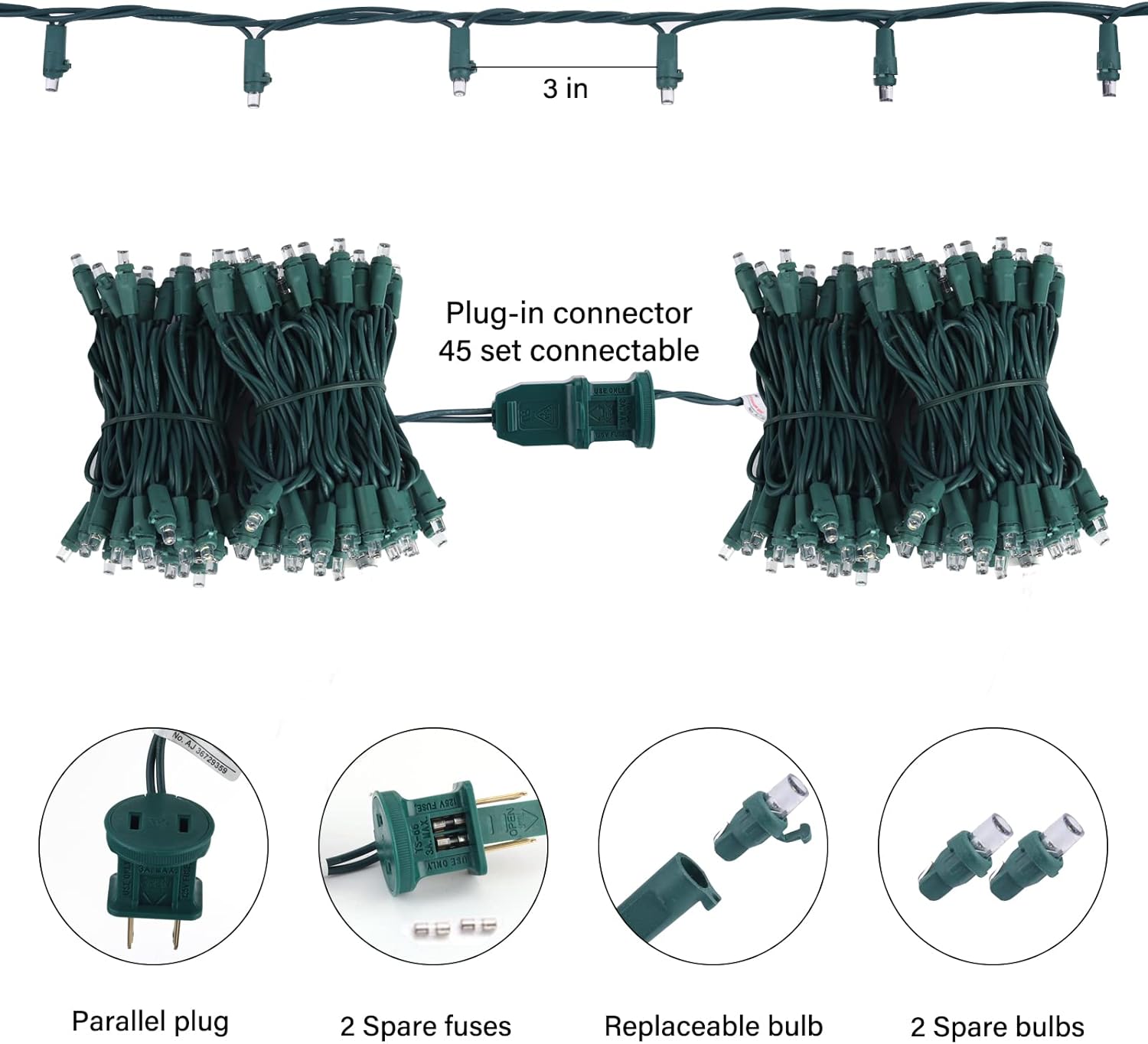 - 【Extensible End-to-End Connection】The total length of 26.5 feet of LED lights allows you to connect up to 45 groups (4500 lights) end-to-end, if one of the strings burns out, the rest of the strings remain on, for extra peace of mind, each light string comes with extra bulbs and replacement fuses, so you don't have to worry about burning out or overloading your bulbs. Note: The AC plug is not waterproof, it should be protected from the rainy day