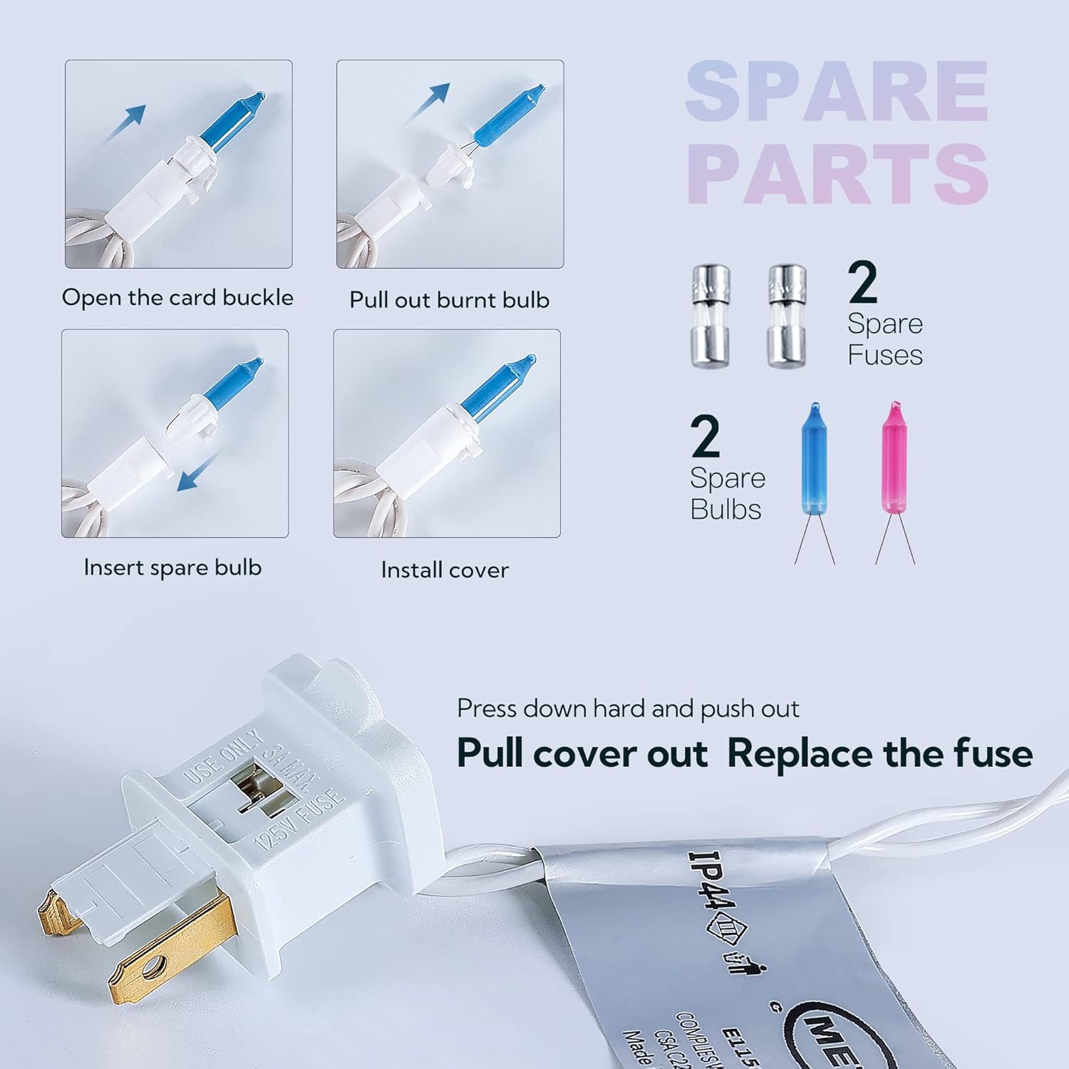 - 🌲Unique Design incandescent mini Lights: The bulb has a snap-on design and is very easy to replace. When one of our bulbs breaks, it doesn't affect the other bulbs. This is a very special design. You can replace damaged bulbs individually with the spare bulb or fuse provided by us.