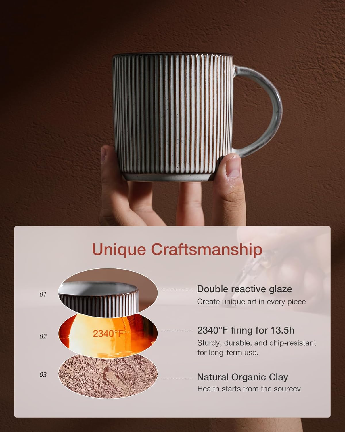 - WITHSTAND THE TEST OF TIME: These coffee mugs are made of organic and natural clay, fired at 2340 ℉ for 13.5 hours to make them sturdy, long-lasting, and chip-resistant for long-term use
