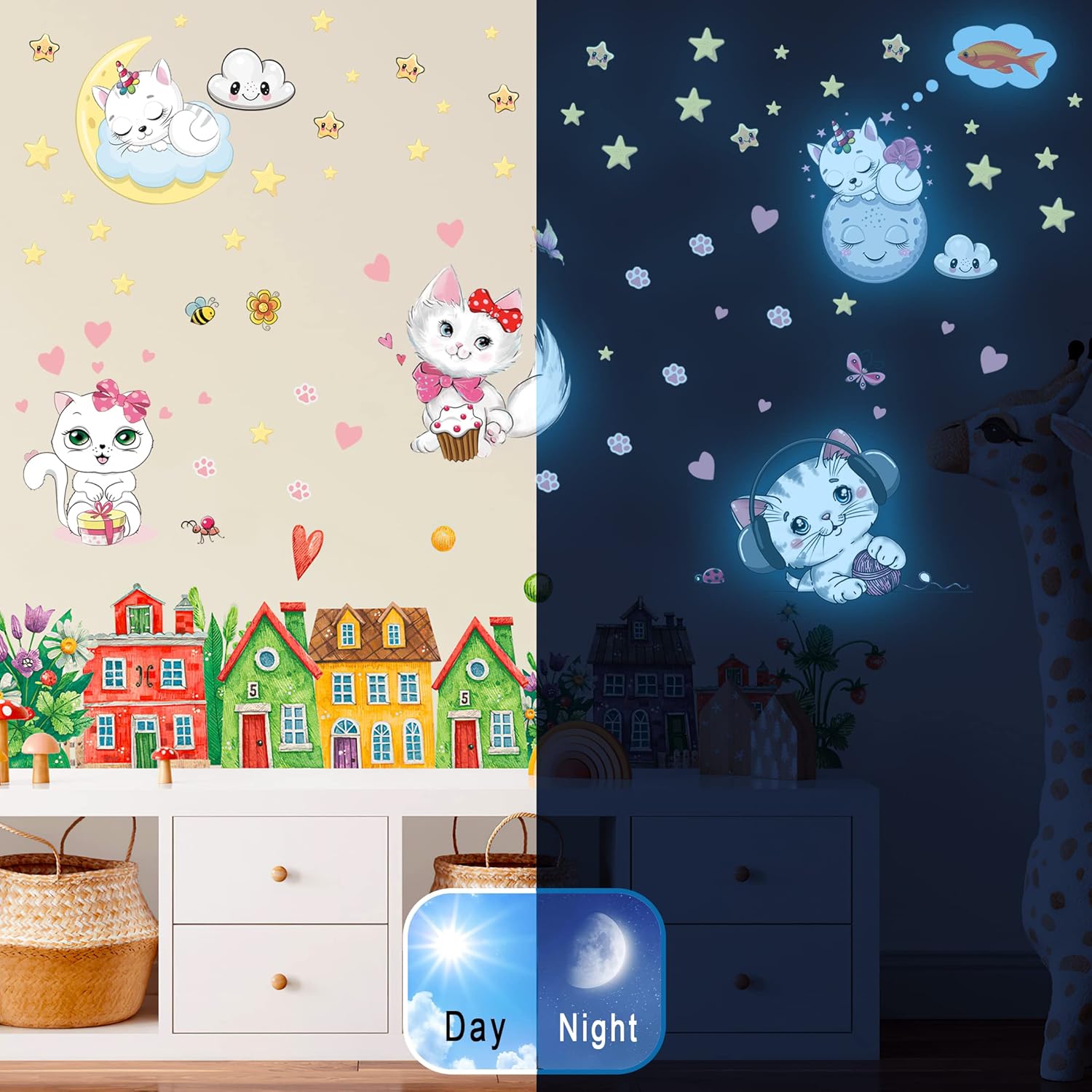 - 【Glow in the Dark Stickers】- These Cats wall stickers are made of quality luminous material. A total of 88 pieces include cats, clouds, stars, butterflies, bees, flowers and other elements, which can be freely combined. It’s a lovely graphic decoration during the day and glows in the dark at night.